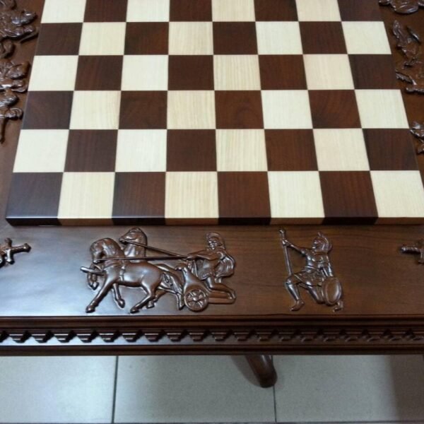 A chess board made of natural wood with light contrasting carving and bead inlay is a stylish and unusual classic.