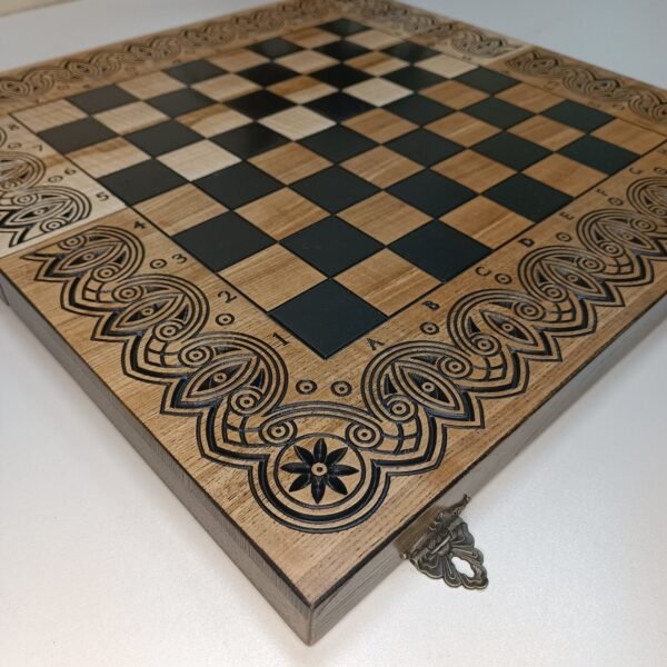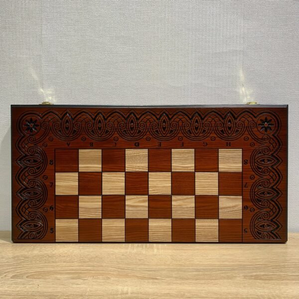 Universal game set 3 in 1 - chess, checkers and backgammon. The folding board is made of ash and decorated with exquisite carving.