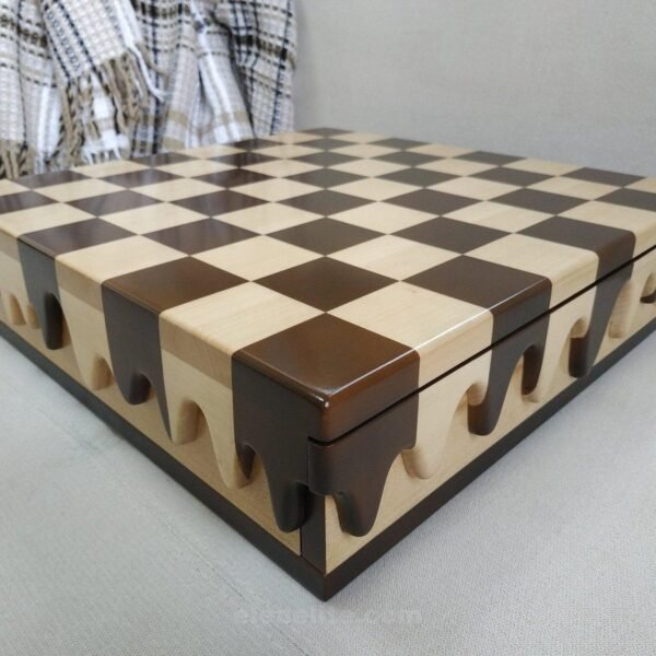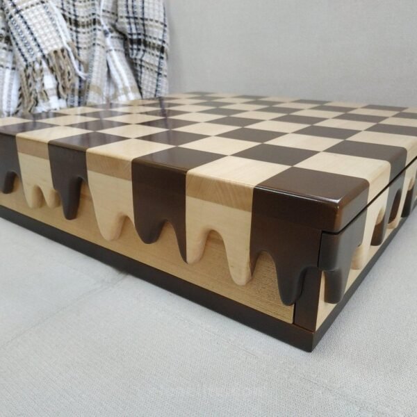 An elegant chess board made of walnut and maple with two drawers for storing pieces. Velvet-lined interior and a unique design featuring artistic side streaks give it a distinctive character.