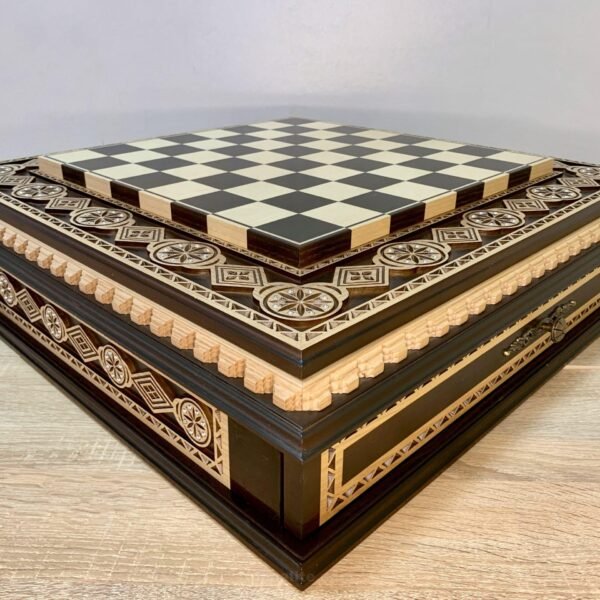 Universal game set 3 in 1 - chess, checkers and backgammon. The folding board is made of ash and decorated with exquisite carving.