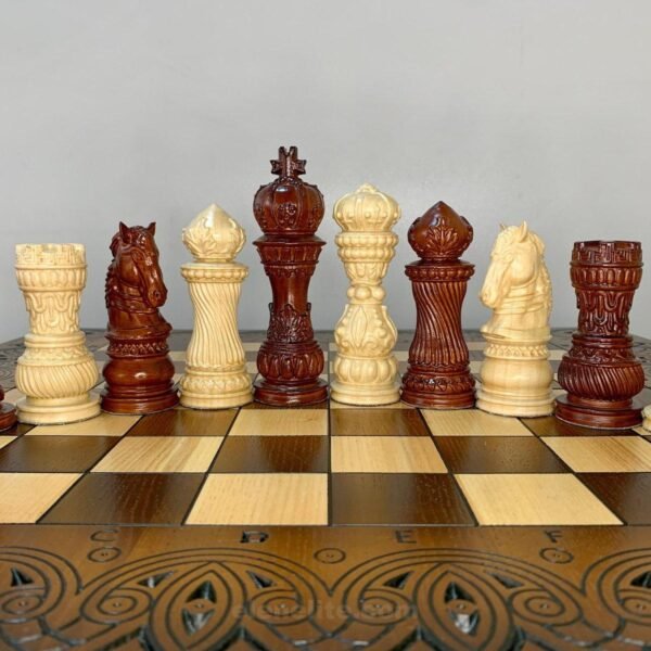 Wooden Chess pieces “Royal Filigree” slavic style with ornamental detailing