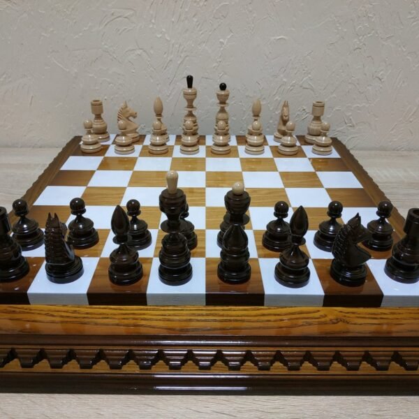 An elegant handcrafted chess set featuring an ash board with two drawers and velvet trim to store the pieces. The brown and white gradient design and glossy finish complement the classic pieces in the same style.