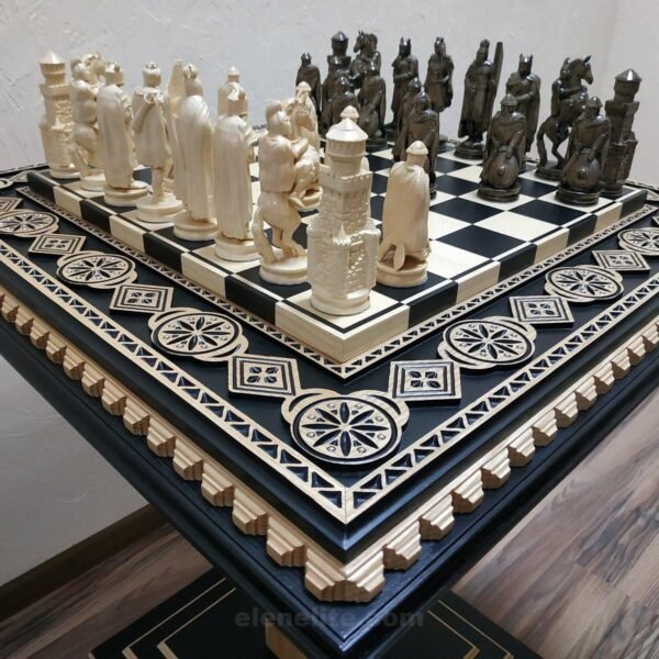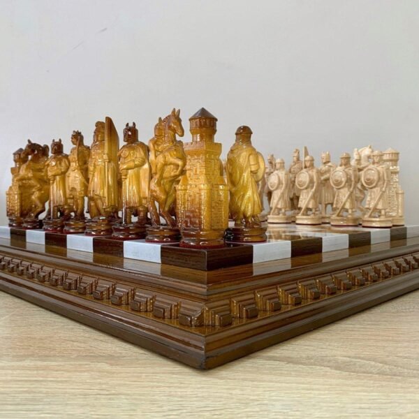 Handcrafted chess set: premium dark brown board and 32 pieces in the form of medieval knights with armor, shields and swords. Detailed carving, high quality workmanship.