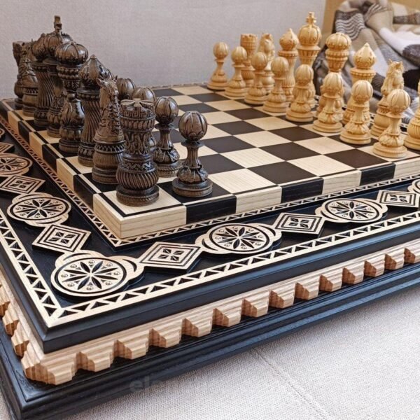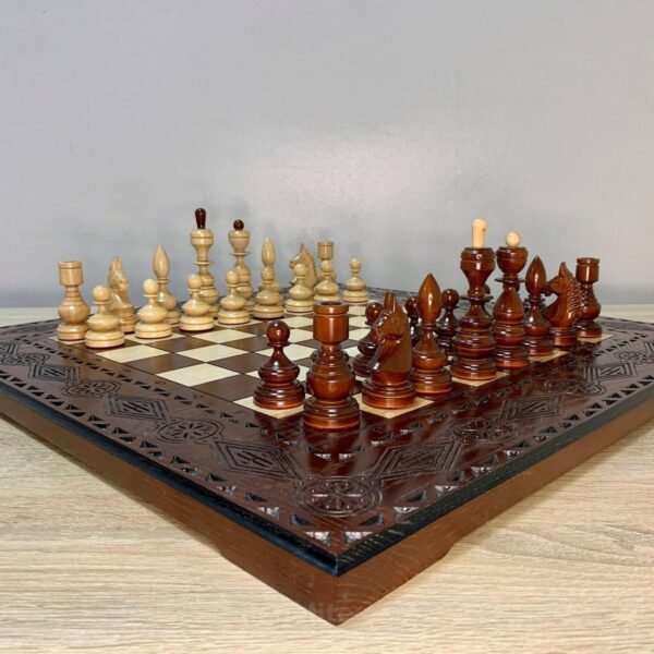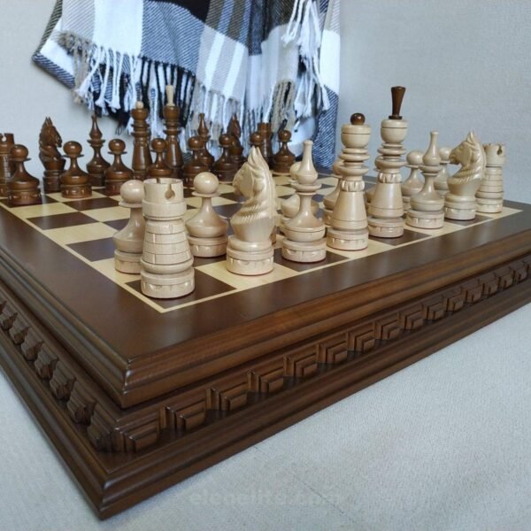 A classic handmade chess set. The board is made of ash in dark brown and decorated with neat carvings. The set includes maple pieces in the same color, made in a classic design.