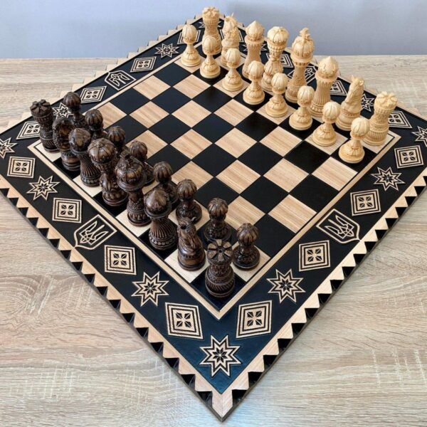 Handcrafted chess set with an ash board decorated with carvings inspired by Ukrainian culture: the eight-pointed star of life and the Ukrainian coat of arms - the Trident. Classic maple pieces complete the exquisite design.