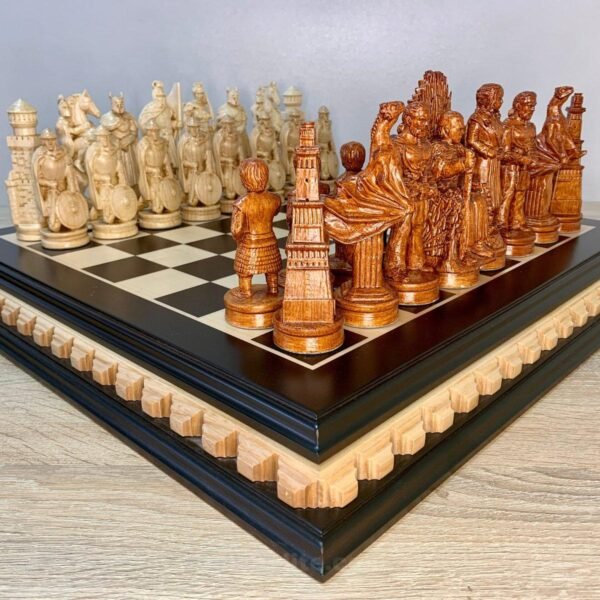 This is a premium handmade chess set. The dark ash board is decorated with light carvings along the edges, emphasizing the aristocratic style. The maple pieces: light knights and dark heroes of the Game of Thrones universe - Jon Snow, Daenerys, Tyrion, the Dragon and Khal Drogo. Each figure is detailed and made with elements of artistic carving.