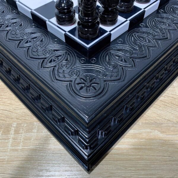 An elegant handcrafted chess set. The ash board is stained deep black, decorated with light carvings around the perimeter and inlaid with decorative beads. The set includes maple chess pieces, perfectly matched in color and style.