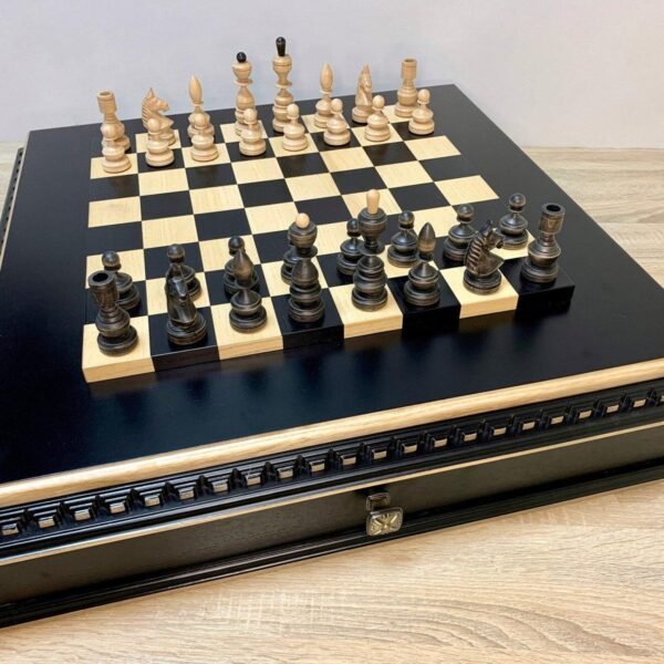 Classic chess set in black and beige tones with two velvet-lined drawers. The set includes Black Stone colored pieces, handmade from maple.