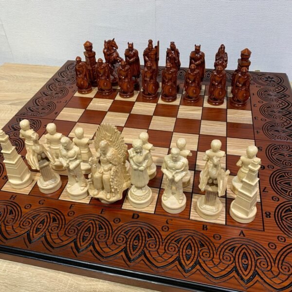 A luxurious chess set: a carved ash board with velvet storage and unique pieces - knights against Ukrainian Cossacks.