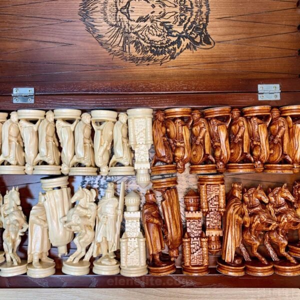 Wooden Chess Set: Glossy Chess board “Royal” + pieces “Knights” & “Cossacks”