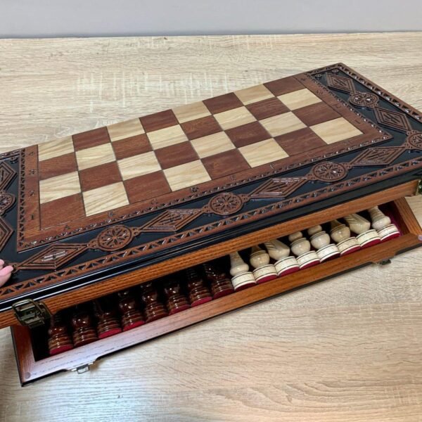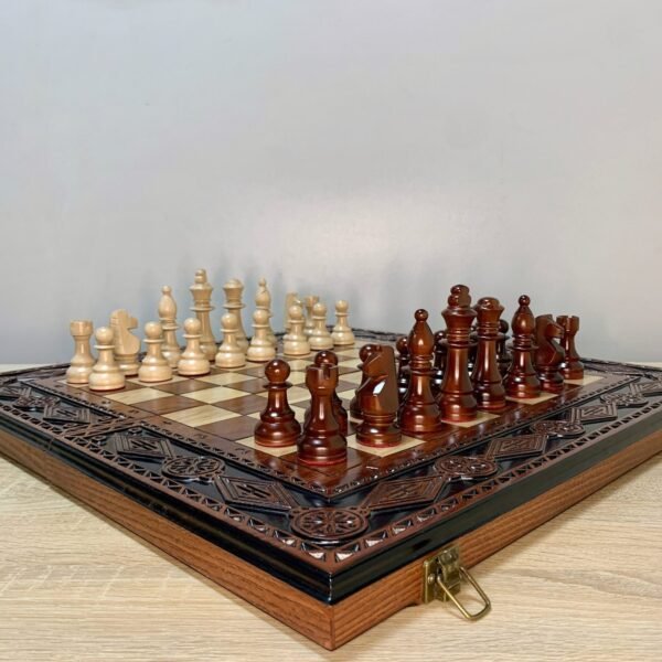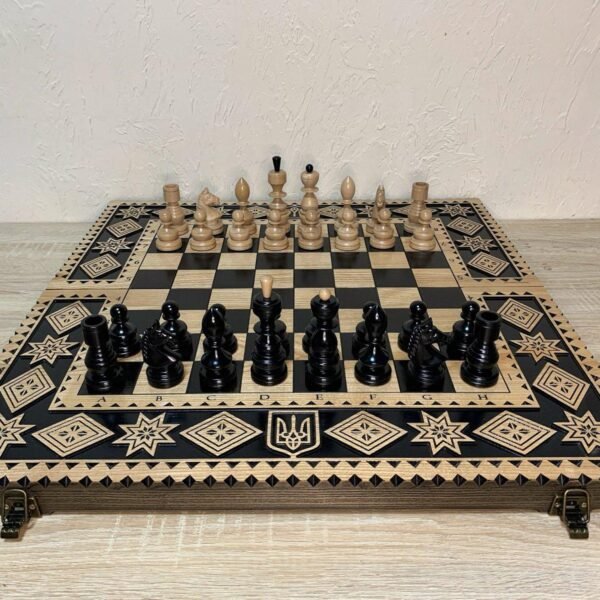 We created this chess set with you in mind: the board is foldable and comfortable, with a soft velour lining for safe storage of the pieces. The elegant design with carvings, an eight-pointed star and the Coat of Arms of Ukraine makes it not only functional, but also beautiful.