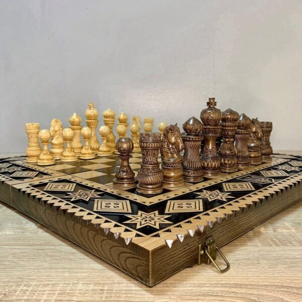Wooden Folding Chess Set 3-in-1: Chess, Checkers and Backgammon + pieces “Knights” + Backgammon Chips