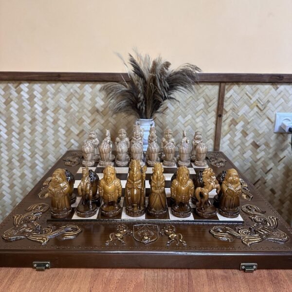 A premium, handcrafted chess set. Carved wooden pieces with an ombre finish and a glossy finish are complemented by a folding dark brown ash board with exquisite engravings of horses, beavers, and ornaments.