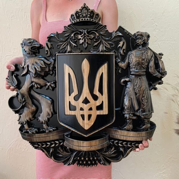 Introducing the exquisite Wooden Coat of Arms of Ukraine with Cossack, Lion, Viburnum – Symbols of Ukraine and Trident. This