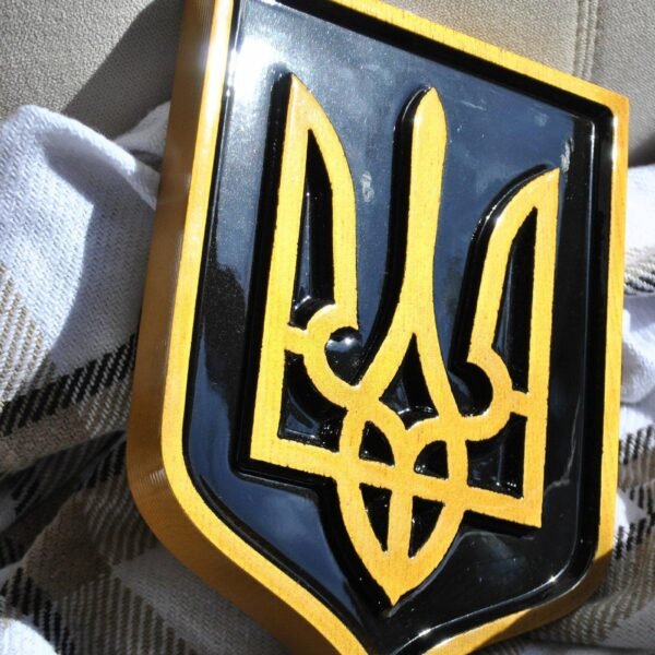 The iconic Ukrainian Tryzub, a symbol of national pride and unity, beautifully depicted in wood, pays homage to Ukraine's rich