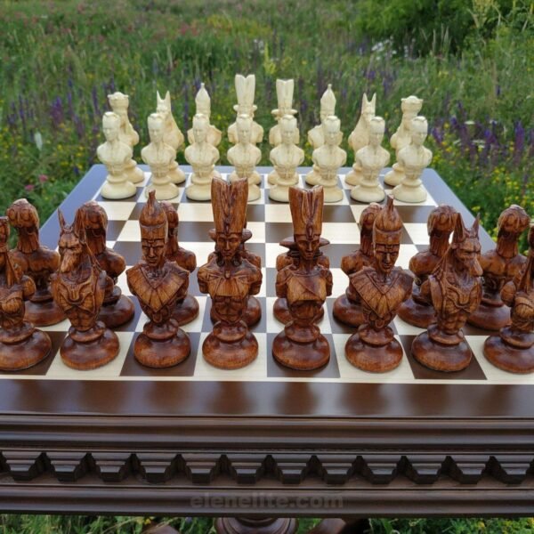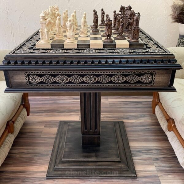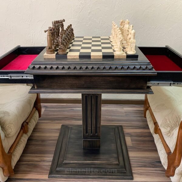 Chess Set: Chess Table “Bright Victory” with 2 Drawers + chess pieces “Cossacks” & “Knights”