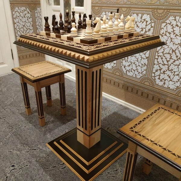 A luxurious set for true connoisseurs: a table with carvings and inlays, comfortable stools and elegant chess in a classic style.