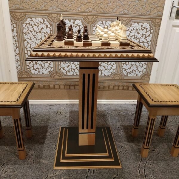 An elegant chess set: an ash table on one leg with contrasting carvings and beaded inlay, a removable board and two stylish stools in a single design.