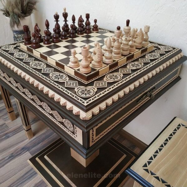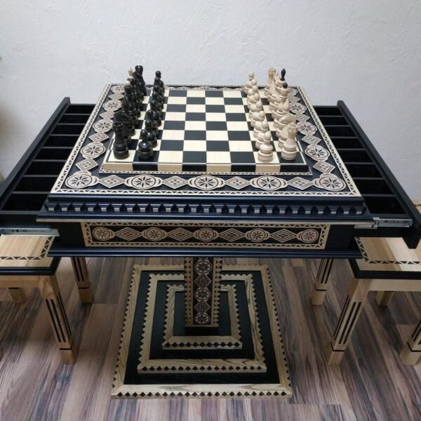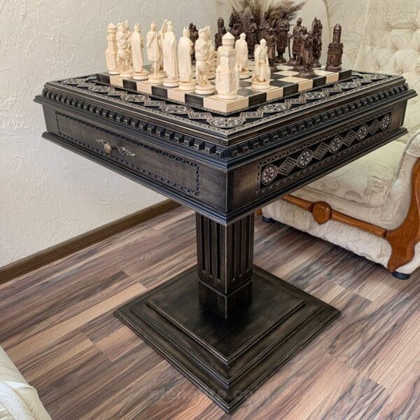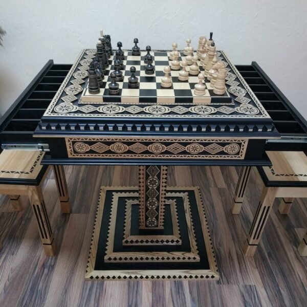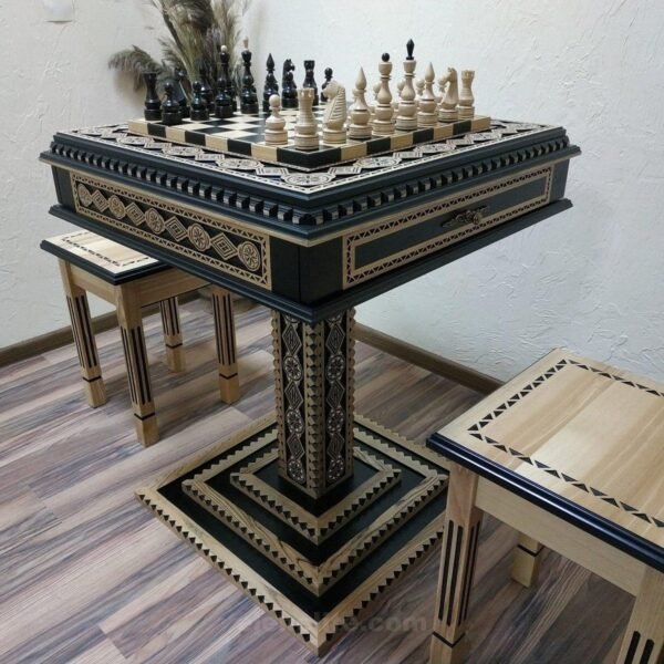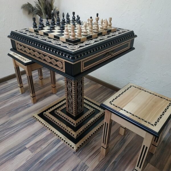 A luxurious handcrafted chess set: a table with carvings and beads, two drawers for storing pieces, elegant stools and chess pieces in the Elegant Classic style. Game and aesthetics in one.