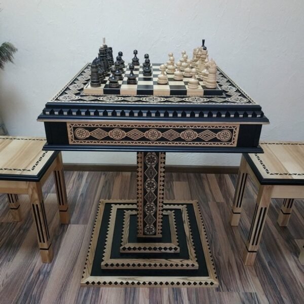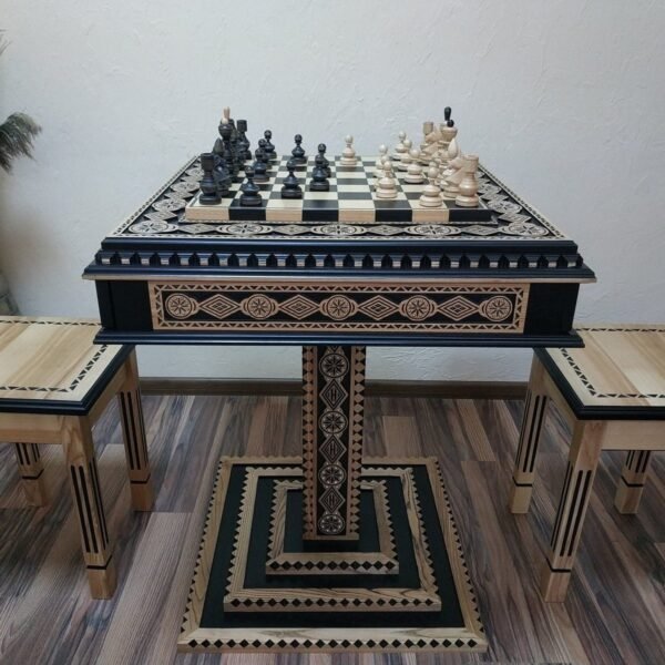 A luxurious chess set that will become the center of attention and decoration of your interior. Black ash table with carving and bead inlay, 2 stylish stools and classic handmade pieces create a perfect combination.