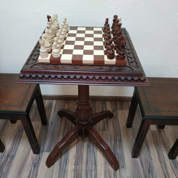 An elegant cherry-colored ash table with handcarved leaves. It comes with two stools and a classic cherry-colored chess set. The perfect set for both play and interior decoration.