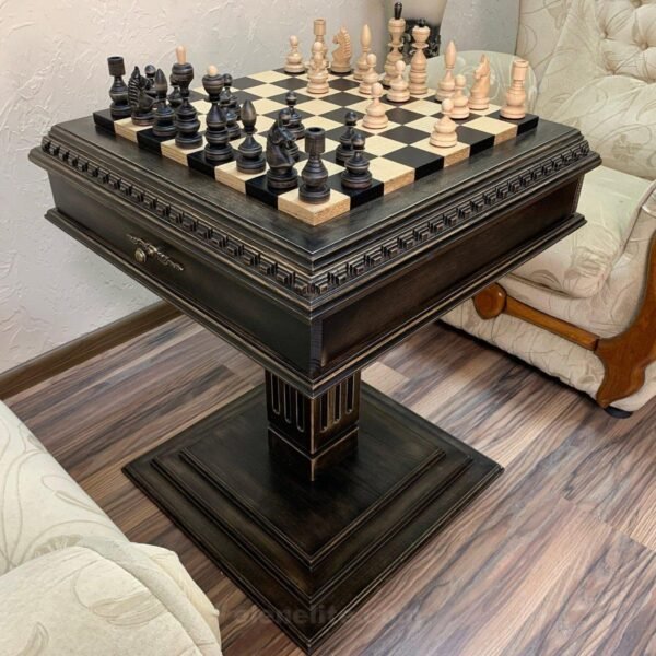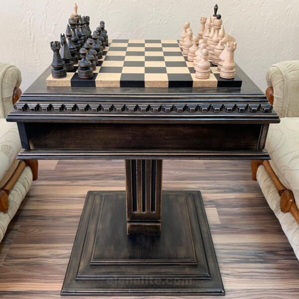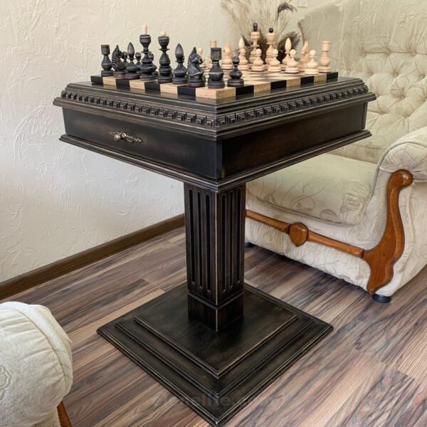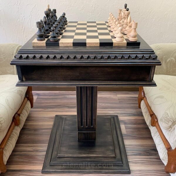Premium chess set: the table is made in the "black patina" technique with a matte finish and chess pieces in the set. The ideal choice for those who value style, comfort and classics in every detail.