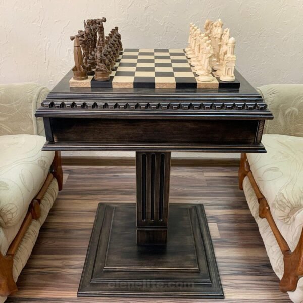 Premium chess set: ash table with carving and drawers for storing pieces. Removable board and classic set of luxury quality pieces make the game as stylish and convenient as possible.