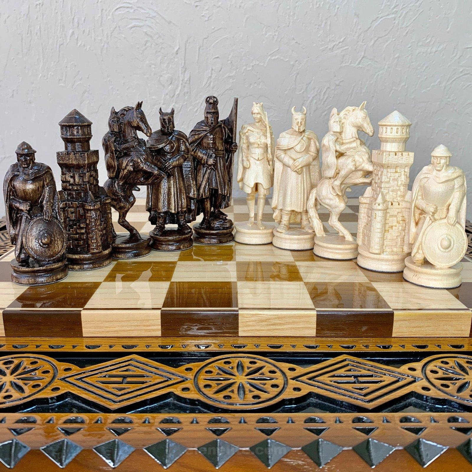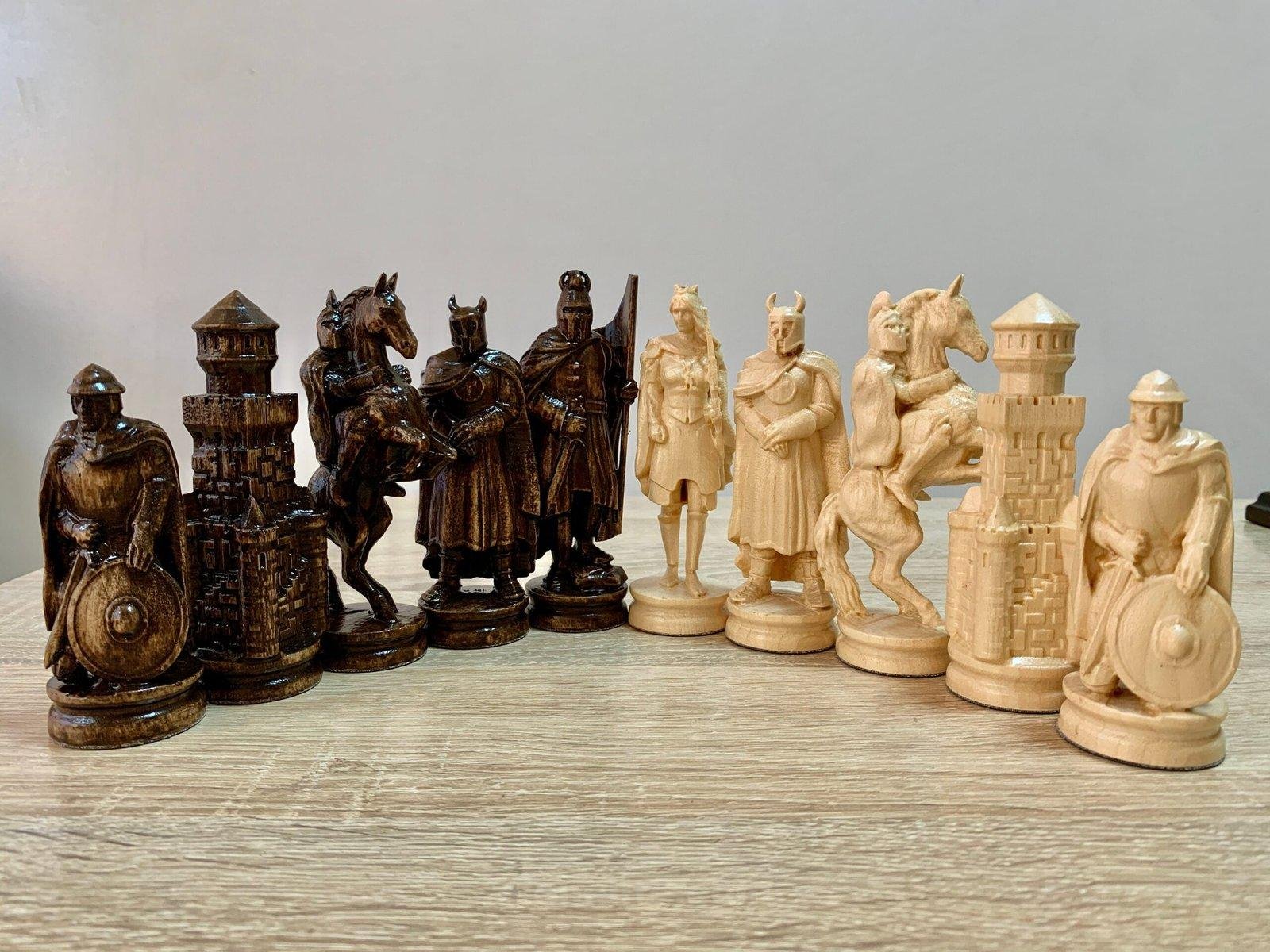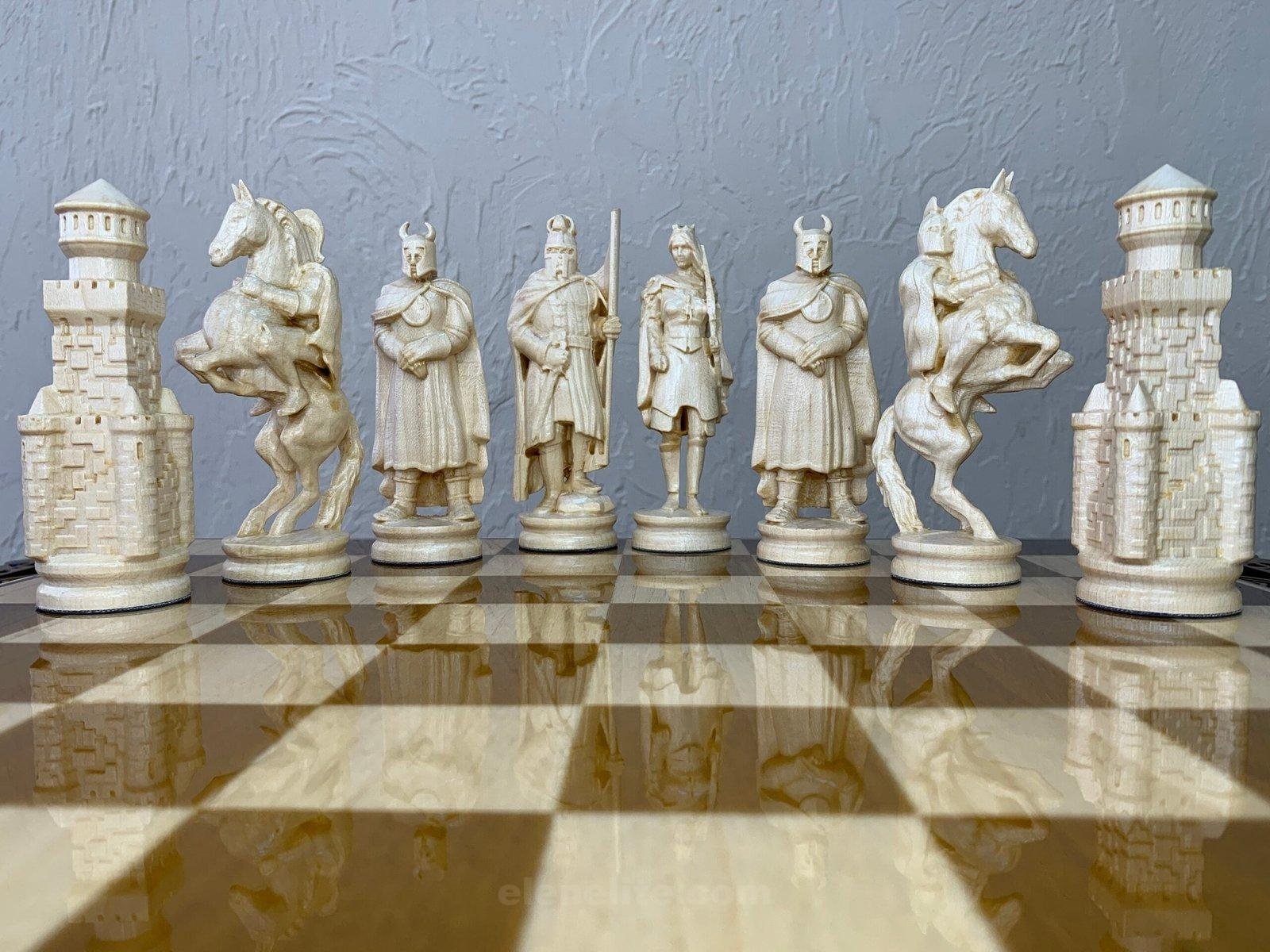 An elegant chess set with a knightly theme. The pieces are hand-carved from maple, painted in contrasting colors: deep black patina and noble beige. The detailed carving and structure emphasize the strength and dignity of each character. A real decoration for the game and the collection.
