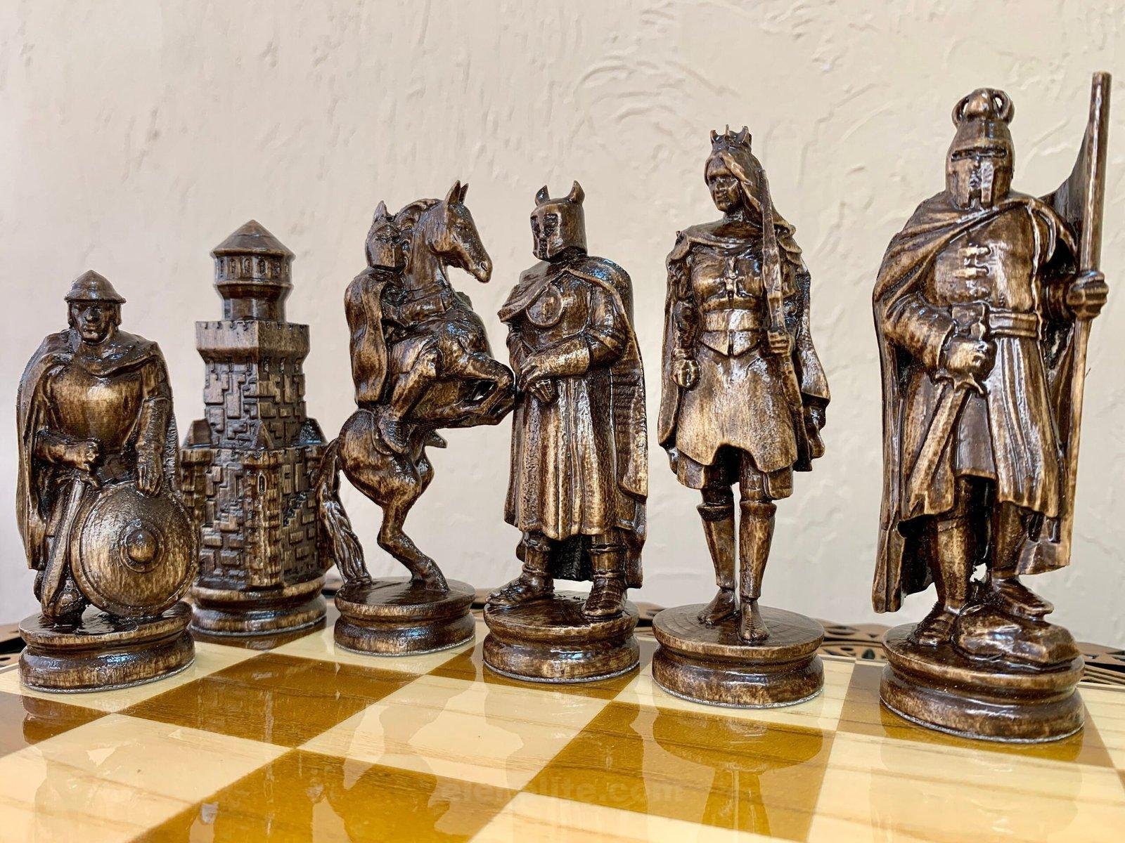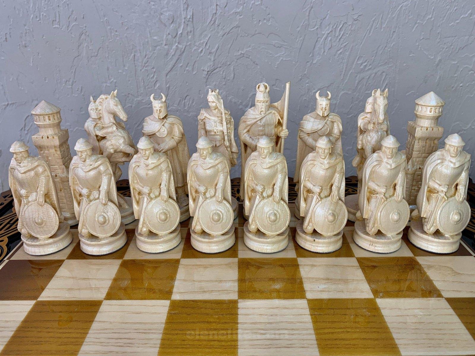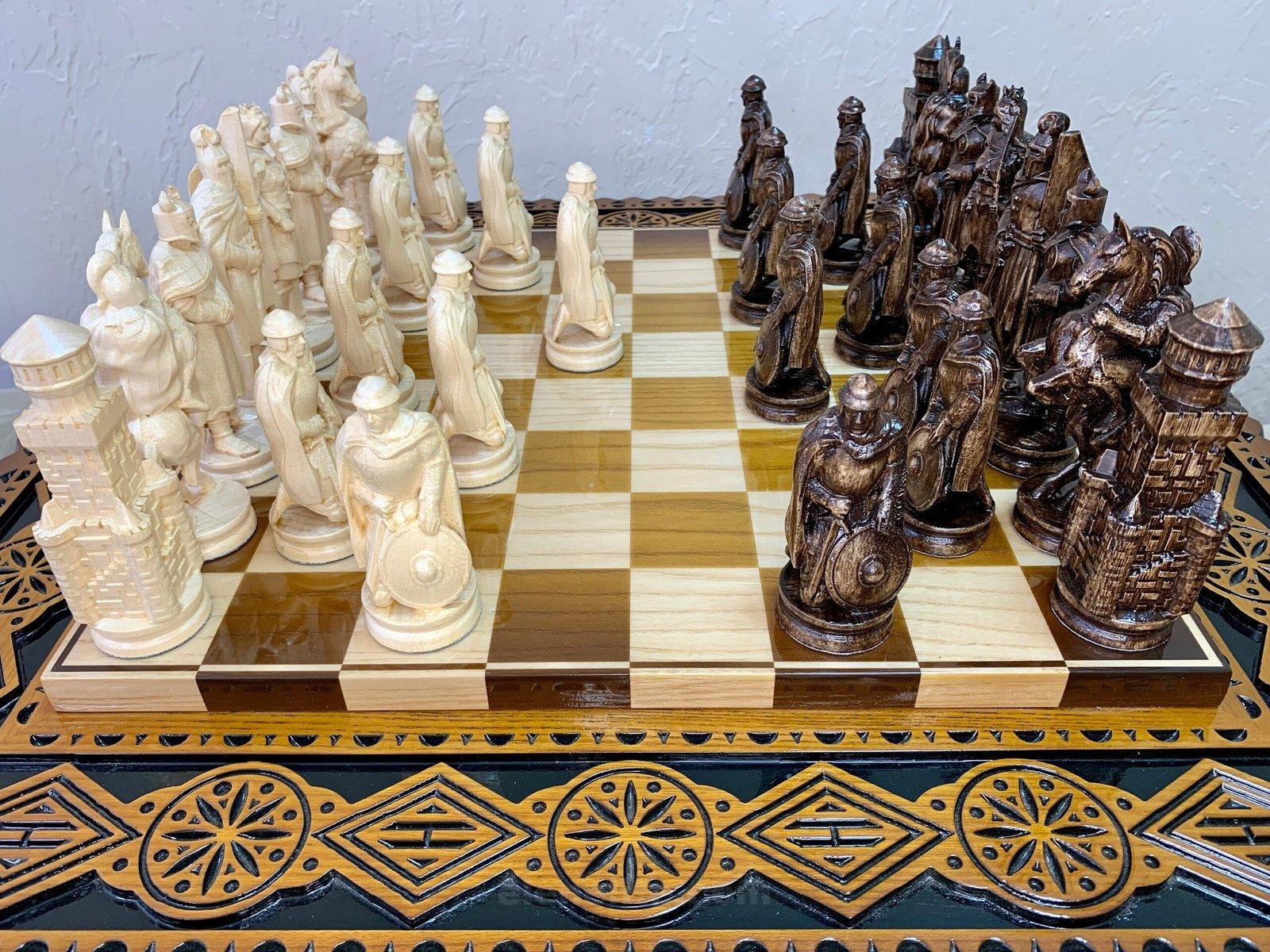 An elegant chess set with a knightly theme. The pieces are hand-carved from maple, painted in contrasting colors: deep black patina and noble beige. The detailed carving and structure emphasize the strength and dignity of each character. A real decoration for the game and the collection.