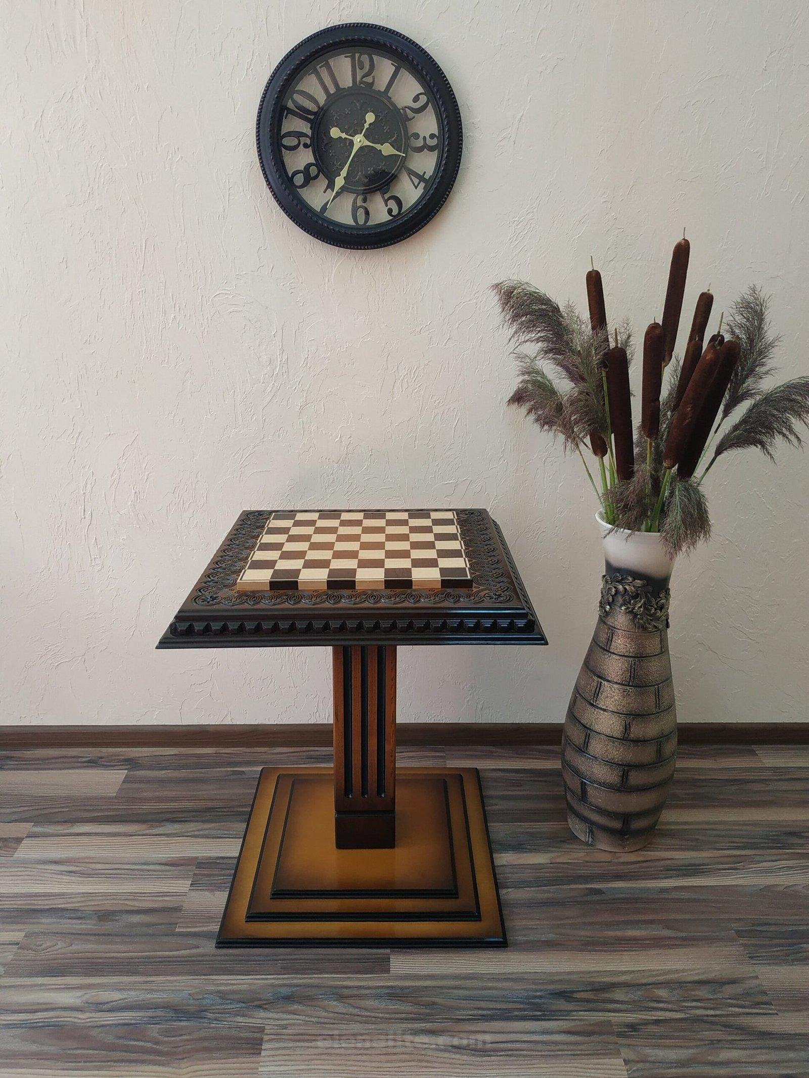 This elegant ash chess table will become the centerpiece of any interior. Its refined design is accentuated by the carvings on the surface, while the deep brown tones with a smooth ombre transition create a stunning visual effect. The table stands on a single, massive leg, giving the structure both lightness and stability. The glossy finish enhances the colors, gives the surface a mirror-like shine, and protects it from wear.