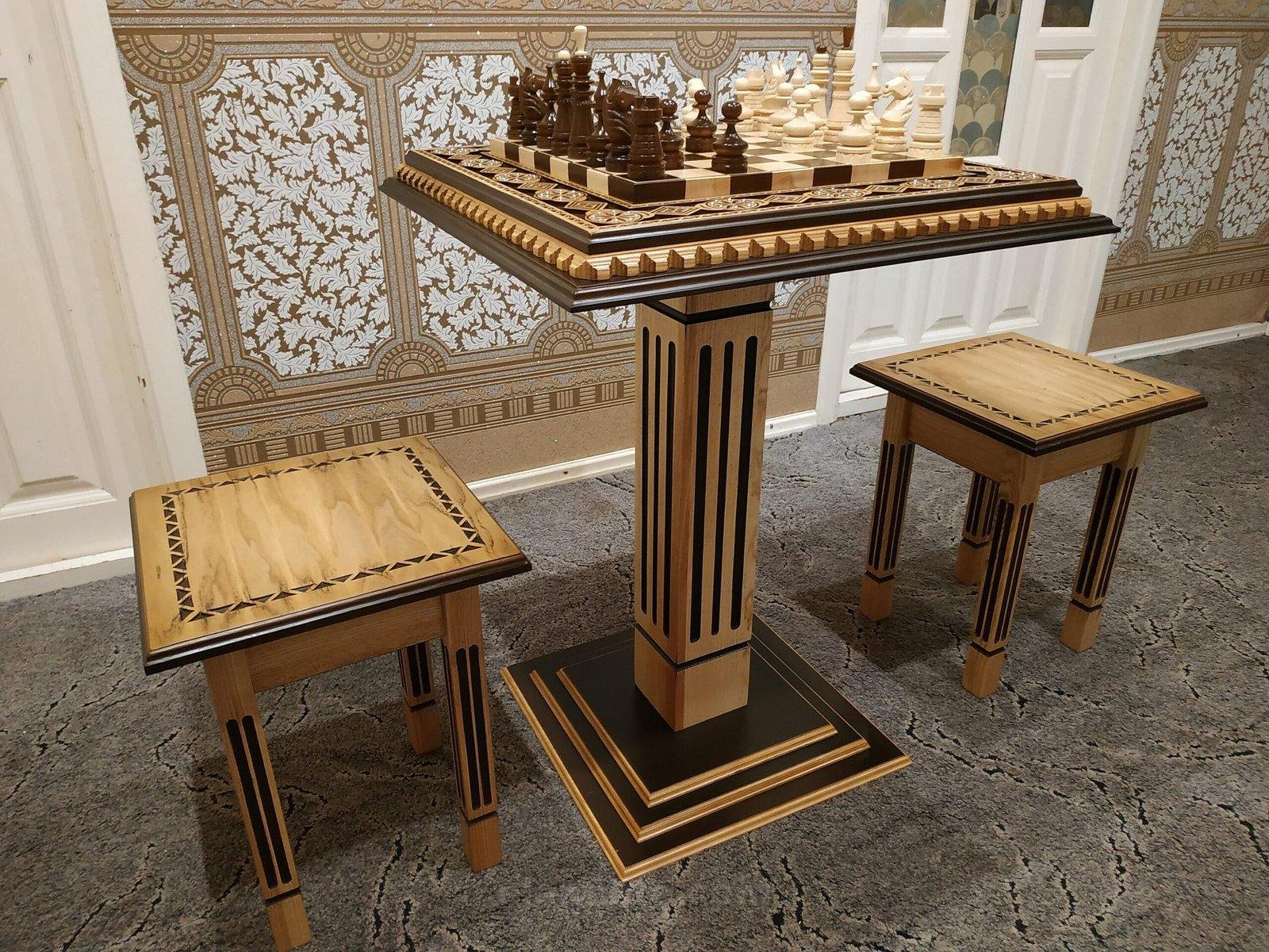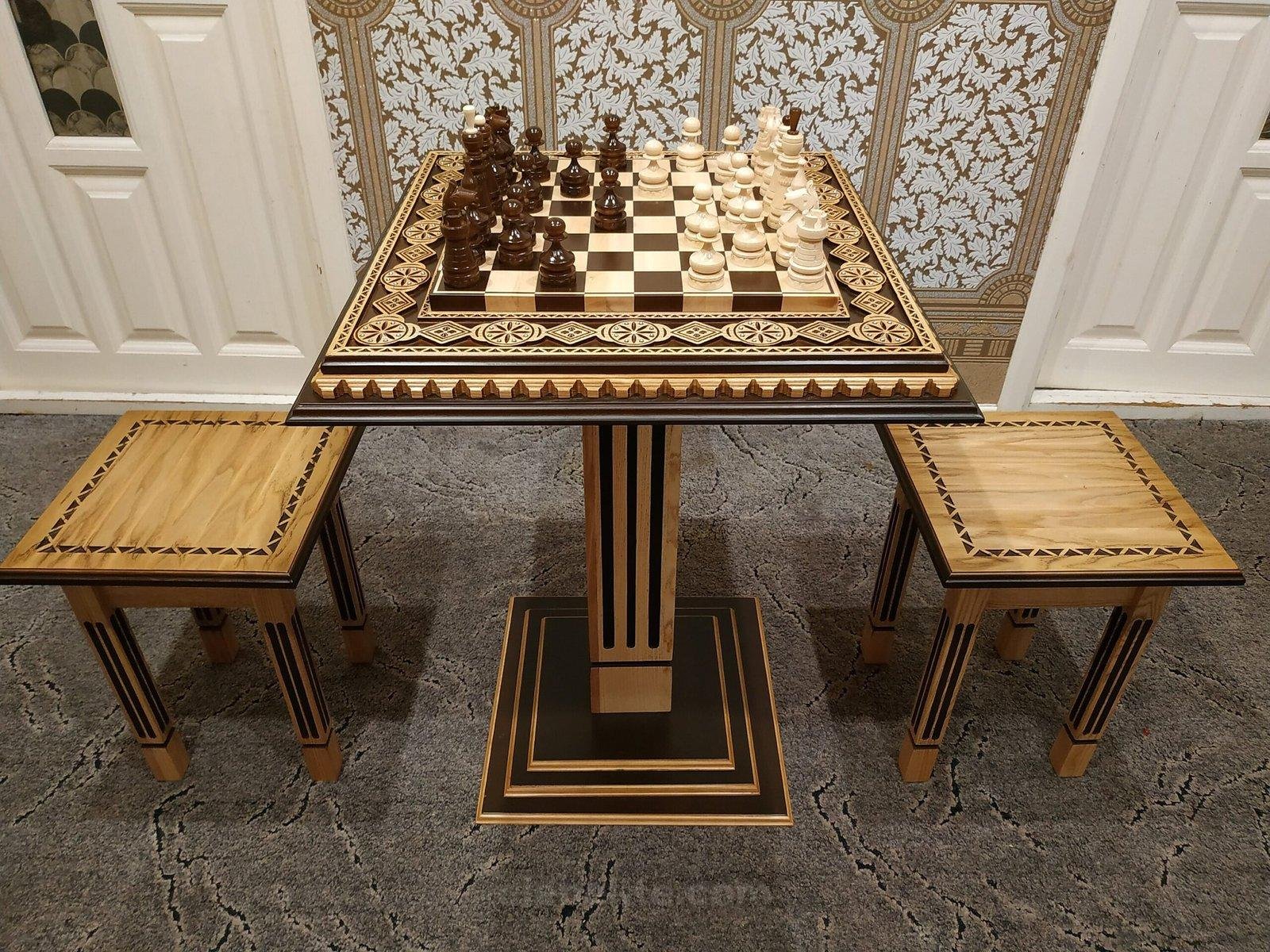 An elegant chess set, which includes an ash table with exquisite carvings and inlays, two stools and classic maple pieces. Everything is thought out for harmony, comfort and beautiful play.
