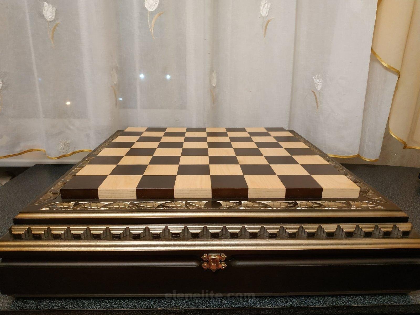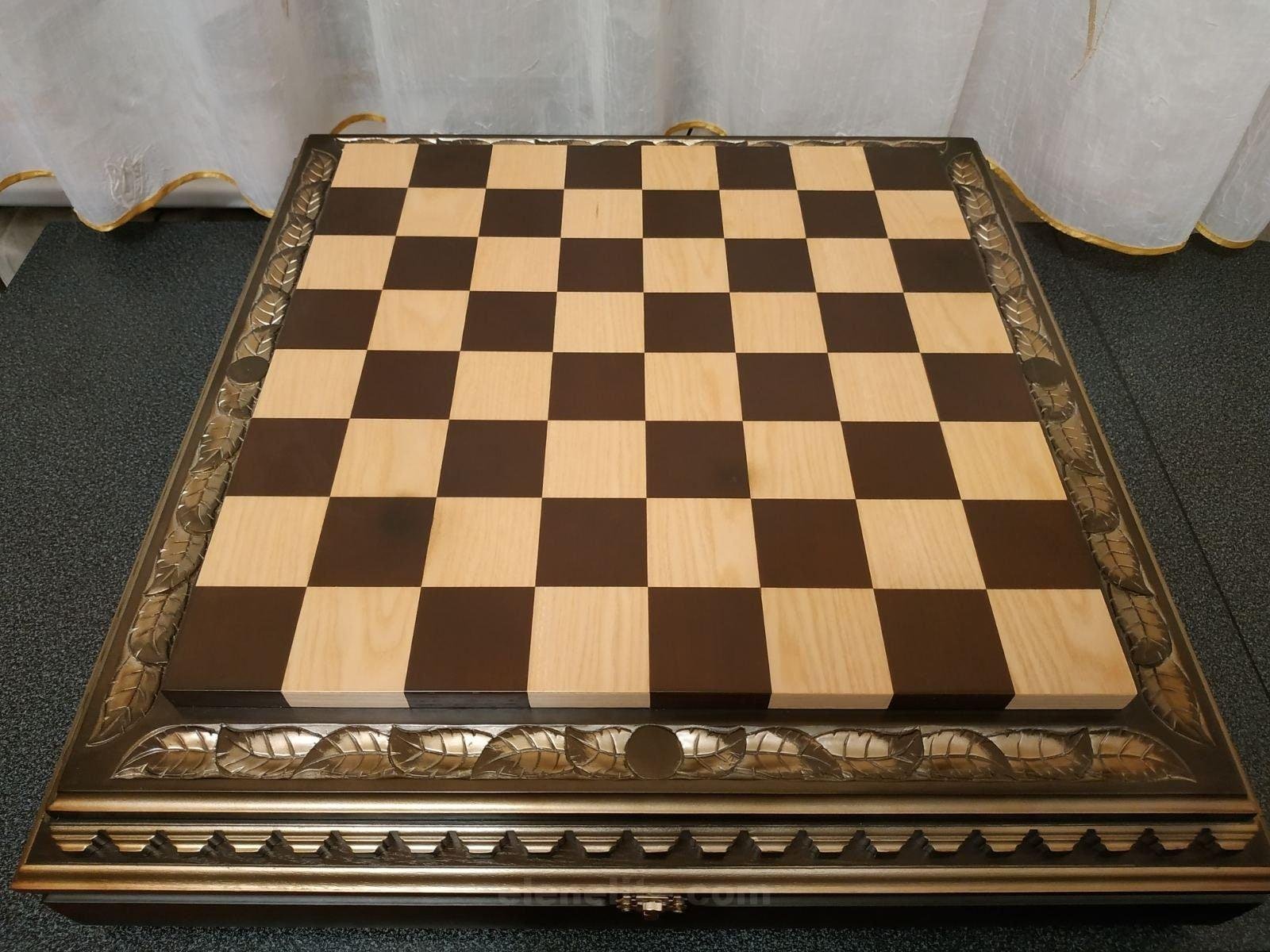 A chess board made of natural ash, created with attention to every detail. Inside there is a velvet compartment for careful storage of pieces. The surface is decorated with exquisite hand carving with gold foliage, which gives the product a special charm.