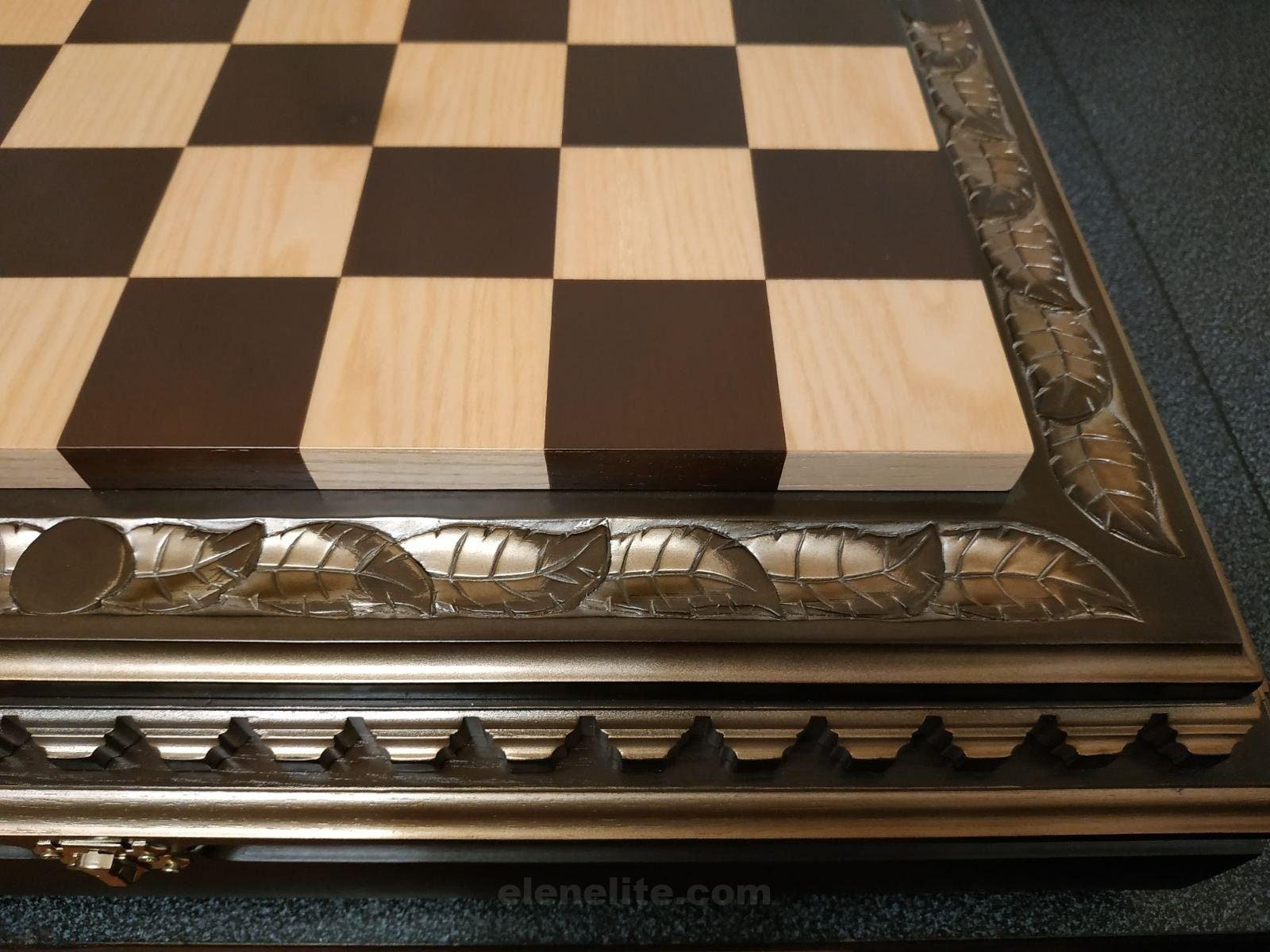 DESIGN: the board has an internal velvet compartment for storing chess pieces, carved with golden leaf designs; exclusively designed by our “Elen Elite” craftsmen.