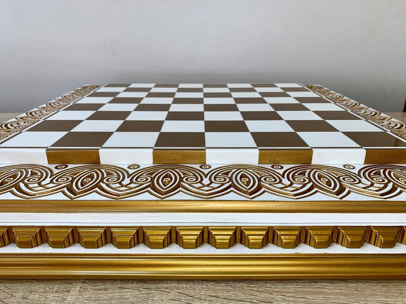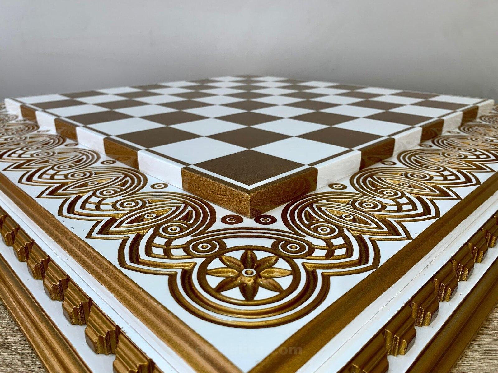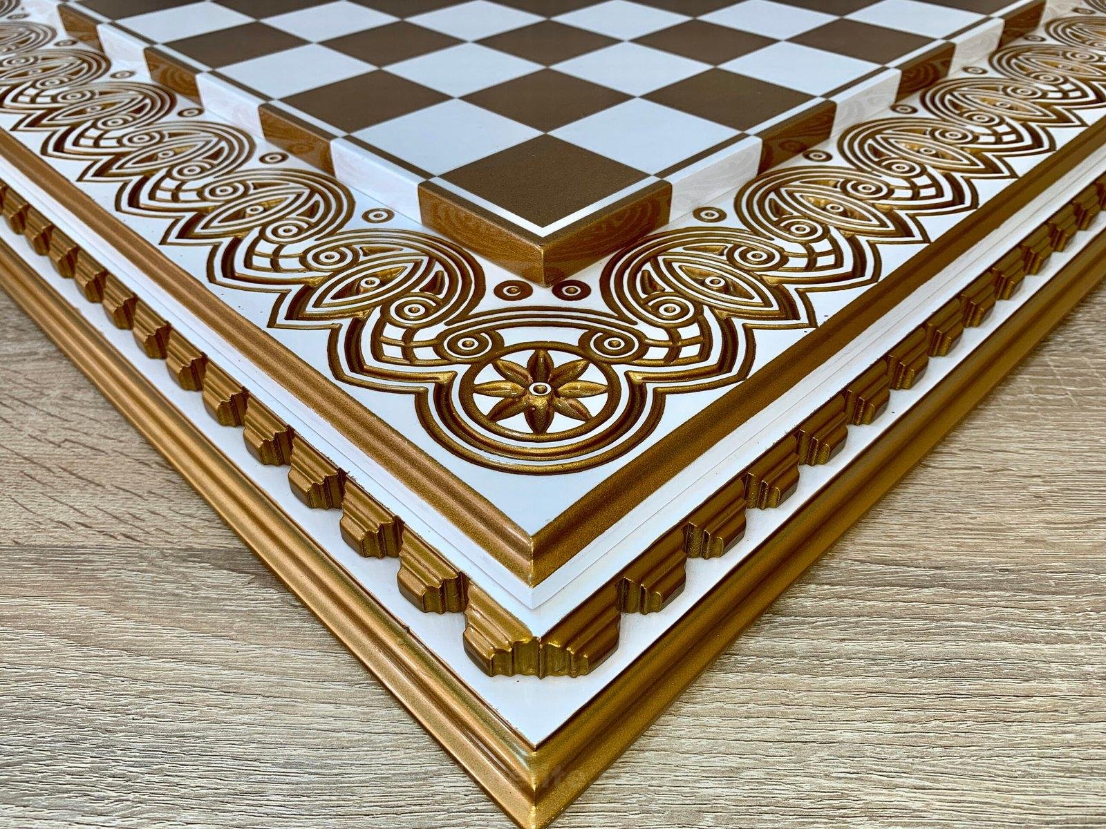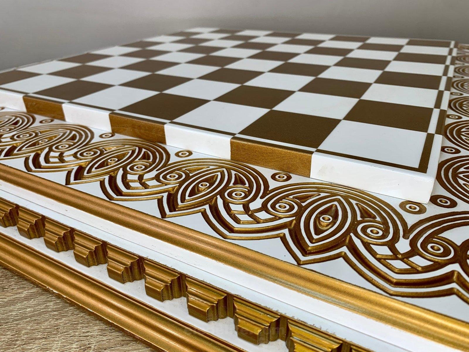 Stunning chessboard in an exquisite combination of gold and white — a true embodiment of elegance and refined taste. Thanks to its handcrafted nature and flawless finish, it becomes not just a playing surface, but a captivating decorative piece.