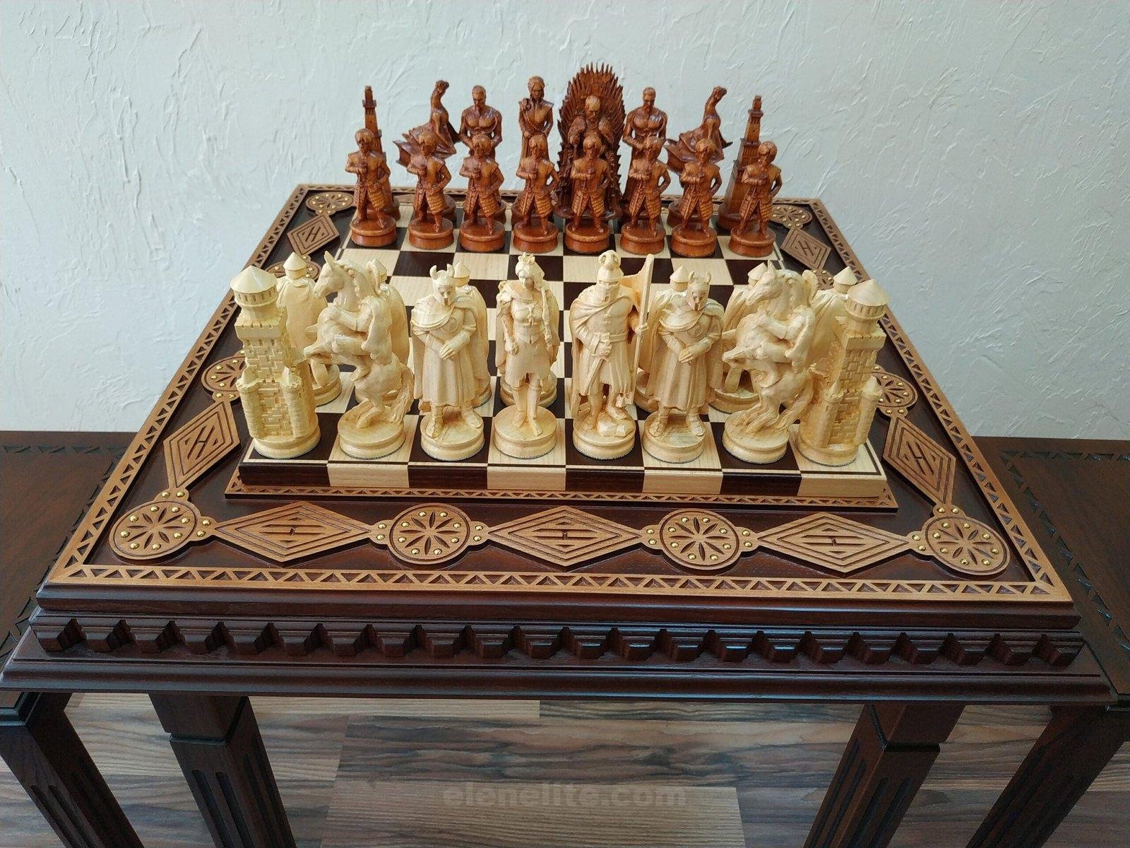Chess board/table "Waves of Aspiration" from ash wood+ pieces "Battle of Thrones"/"Knights" two stools handmade Аnniversary wooden gift