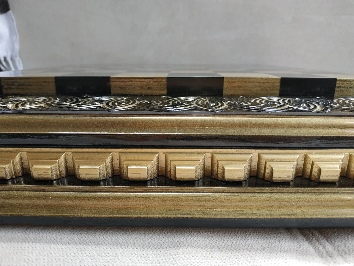 Crafted from solid ash, this chessboard embodies a balance of bold design and exquisite craftsmanship. The deep black surface is complemented by gold accents, creating a striking contrast. The glossy finish gives the board a smooth, reflective surface, highlighting the richness of the tones and adding a refined sheen. Carved elements add texture and depth, highlighting the handcrafted look.