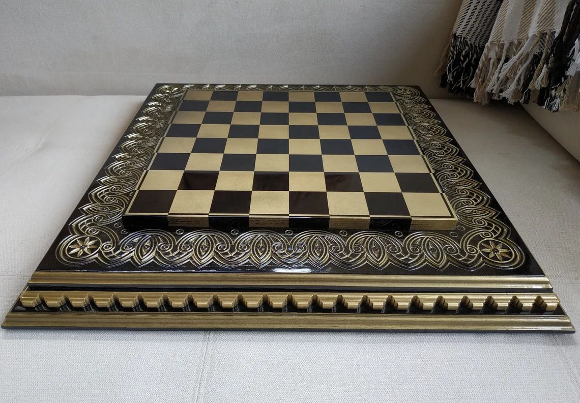 Handcrafted ash wood chess board in a black and gold finish. Polished to a high gloss and enhanced with carved details for a refined, statement look.