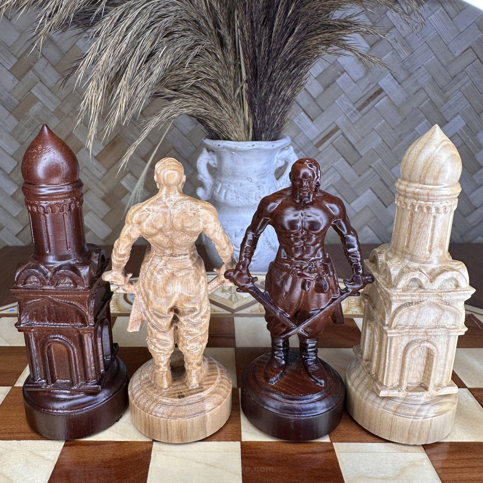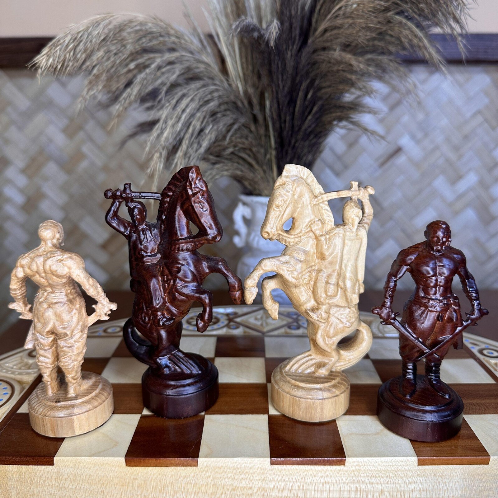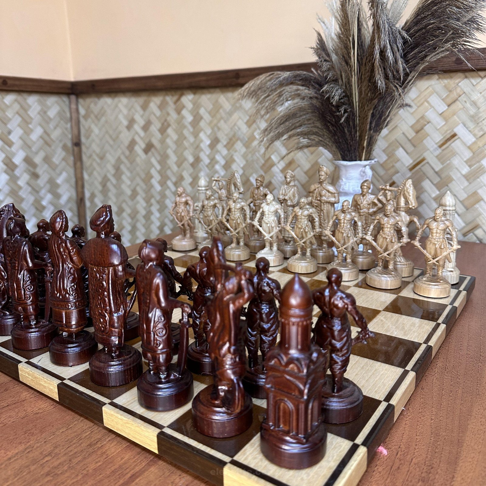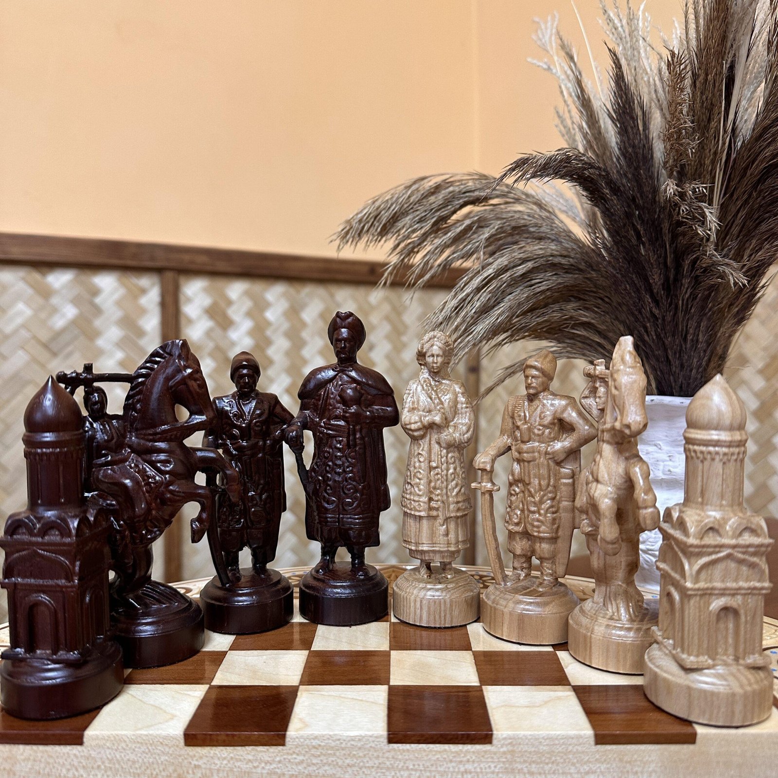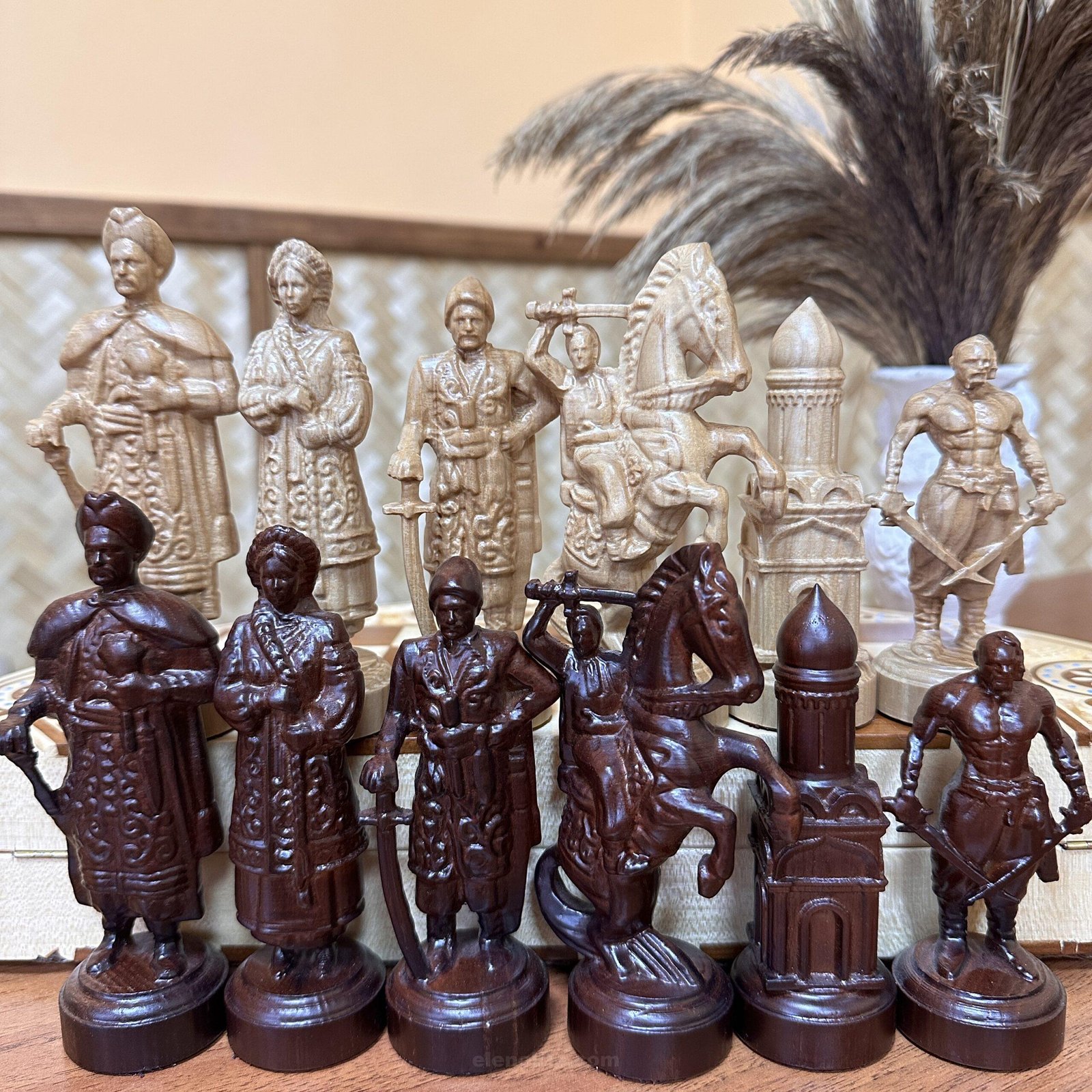 An original set of chess pieces inspired by the Ukrainian Cossacks. Each piece is hand-carved from durable maple and reflects the character and courage of the heroes. The king is the ataman, the main warrior and strategist, and the other pieces are Cossack warriors. The color scheme in red and beige emphasizes the texture of the wood, creating a spectacular collection. This set will not only be the center of attention in any game, but also a unique gift.