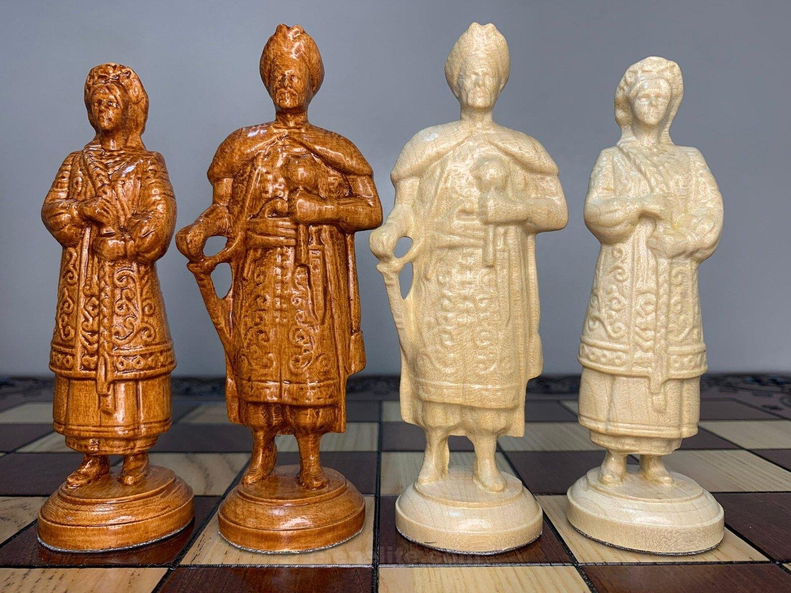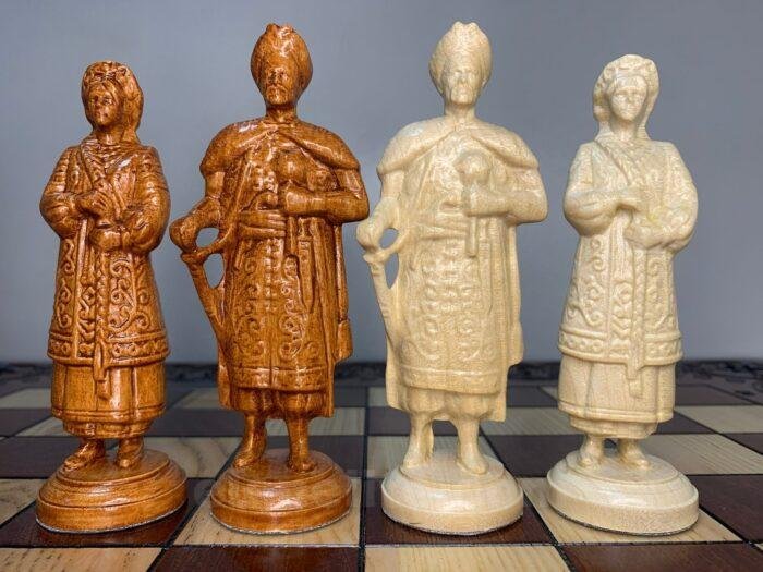 Unique chess pieces in the form of Ukrainian Cossacks. Otaman as a king, handmade from maple, premium quality, expressive texture and detailing.