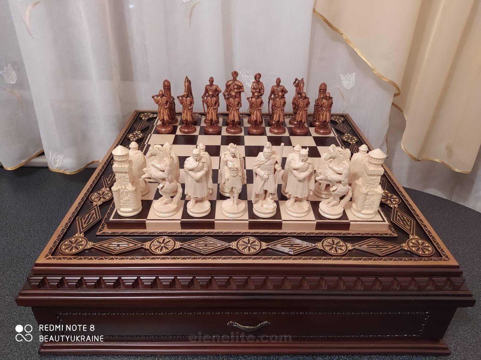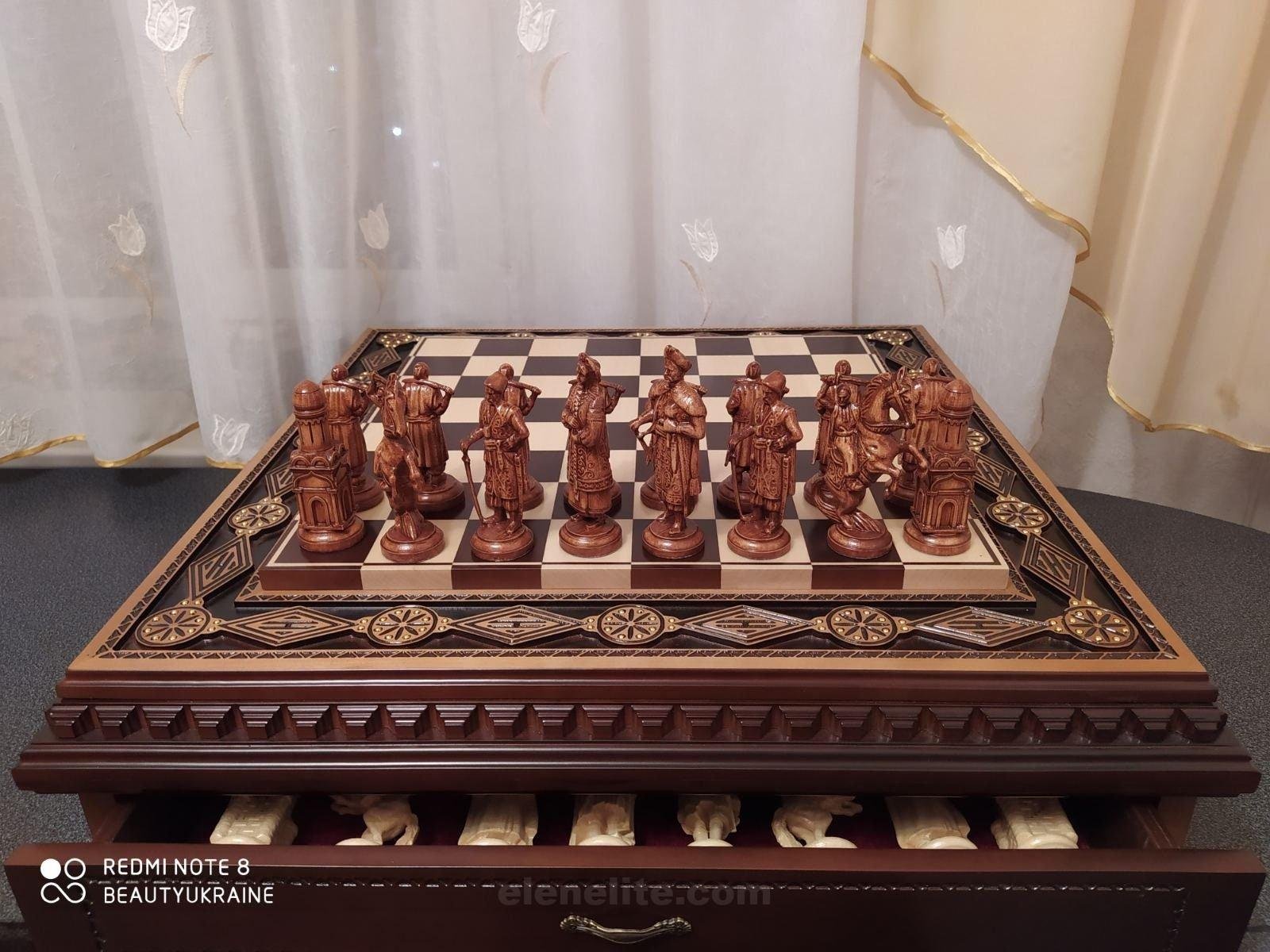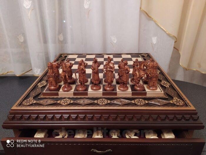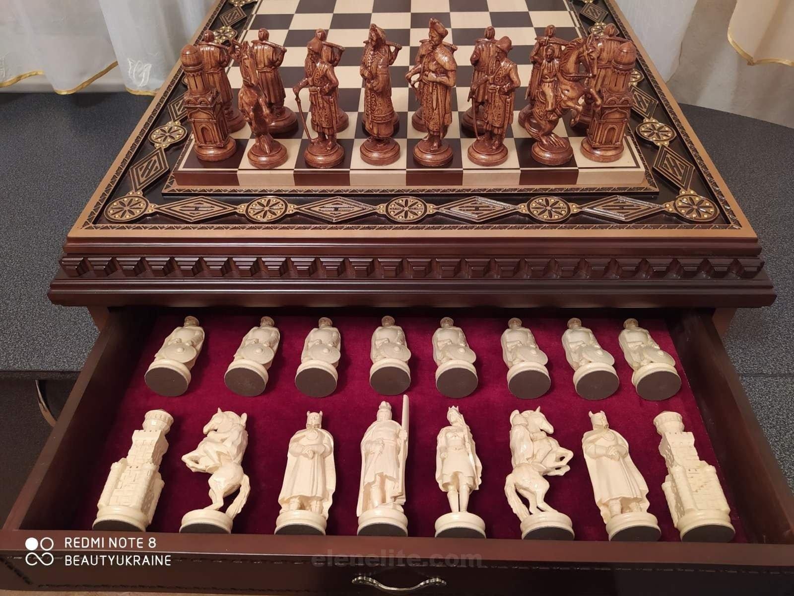 DESIGN: the chess board is equipped with 2 drawers for storing chess pieces and is inlaid with a beads; the chess pieces are made in the form of Knights and Ukrainian Cossacks; exclusively designed by our “Elen Elite” craftsmen.
