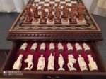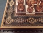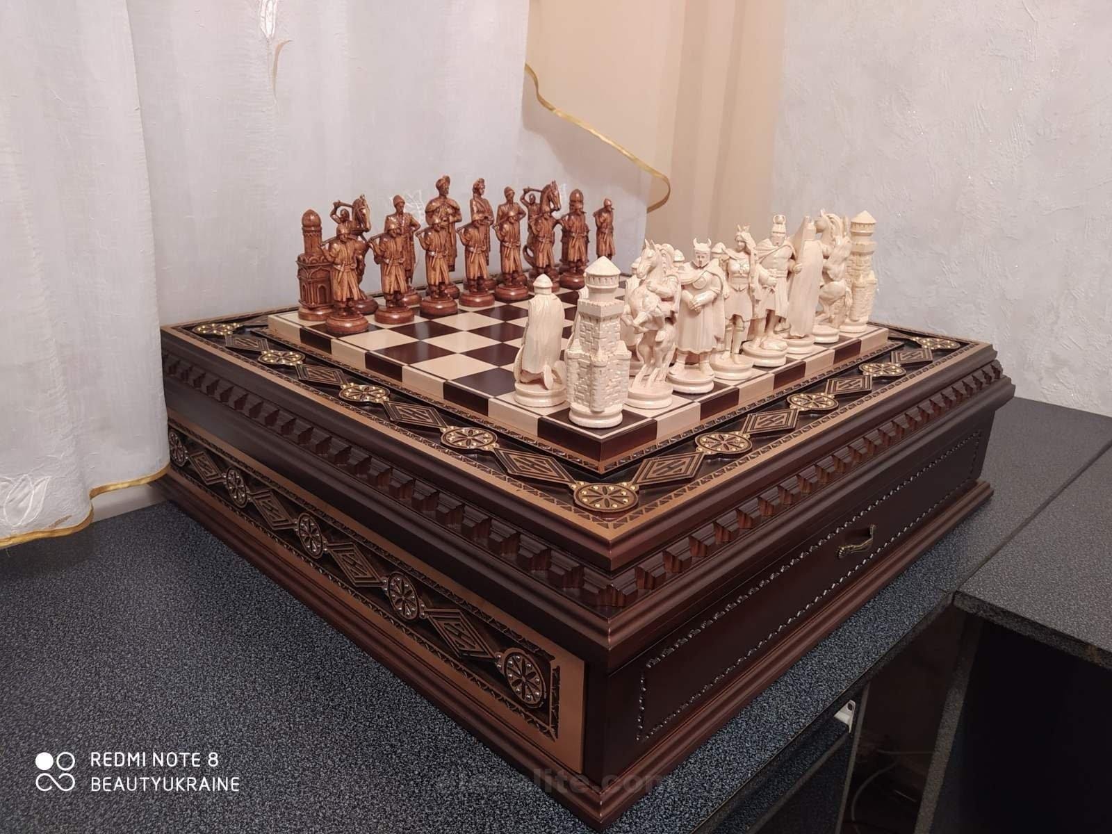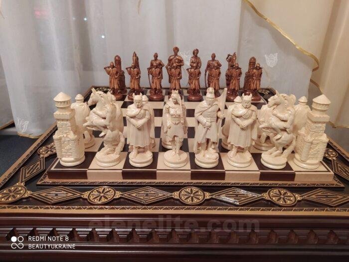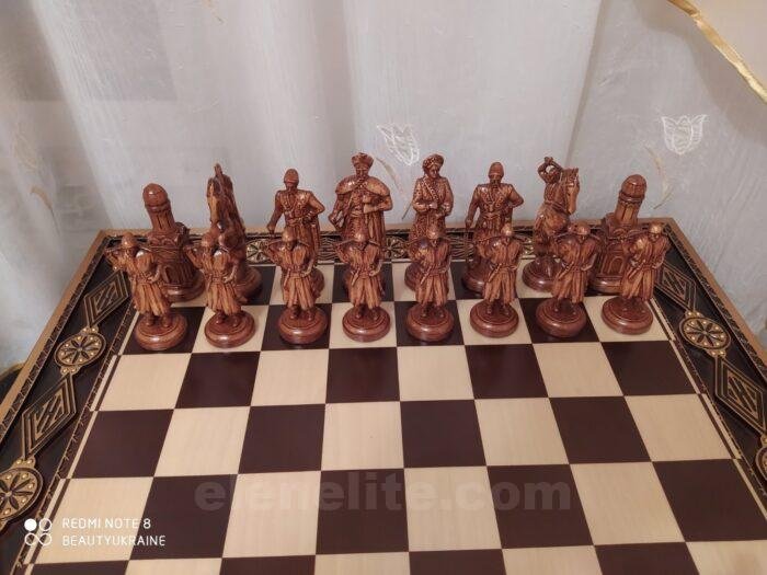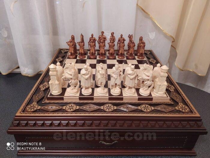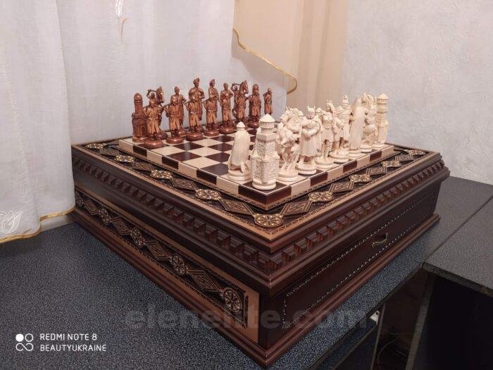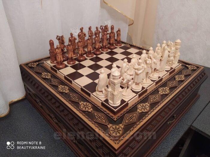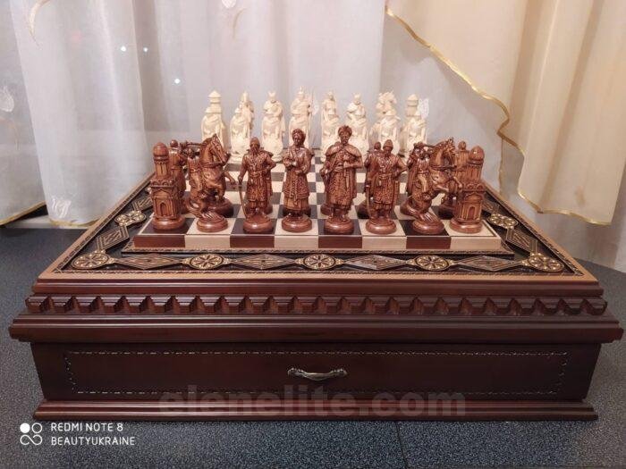 DESIGN: the chess board is equipped with 2 drawers for storing chess pieces and is inlaid with a beads; the chess pieces are made in the form of Knights and Ukrainian Cossacks; exclusively designed by our “Elen Elite” craftsmen.