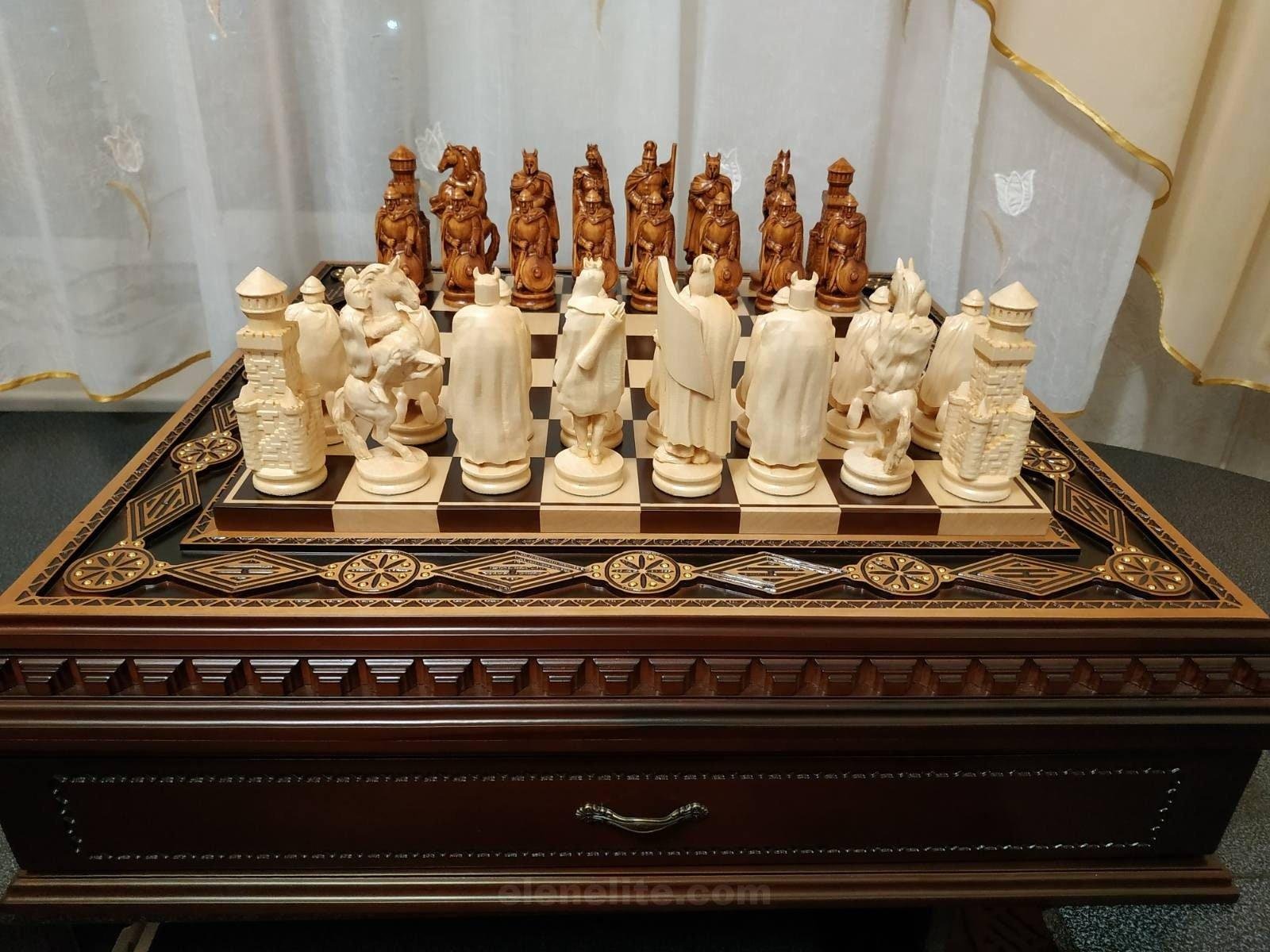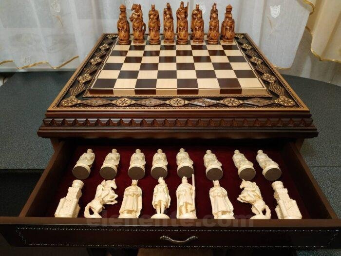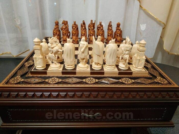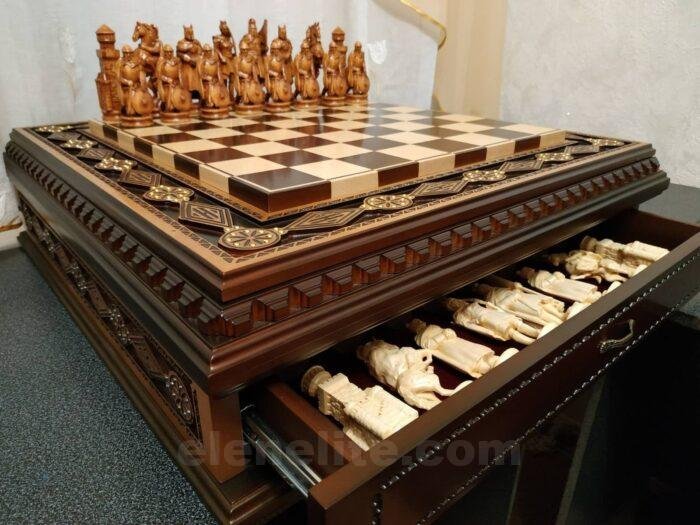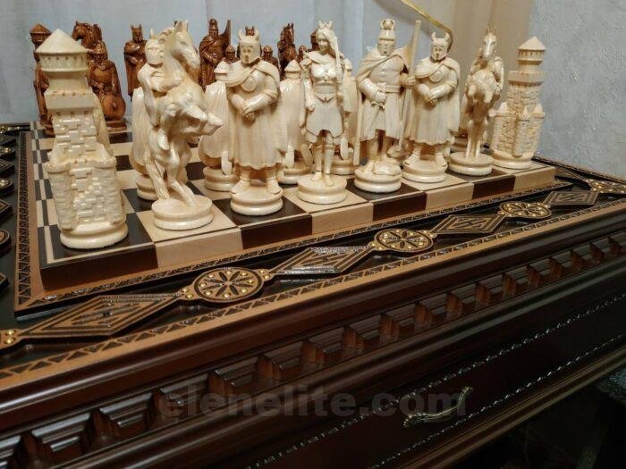 DESIGN: the chess board is equipped with 2 drawers for storing chess pieces and is inlaid with a beads; the chess pieces are made in the form of Knights; exclusively designed by our “Elen Elite” craftsmen.