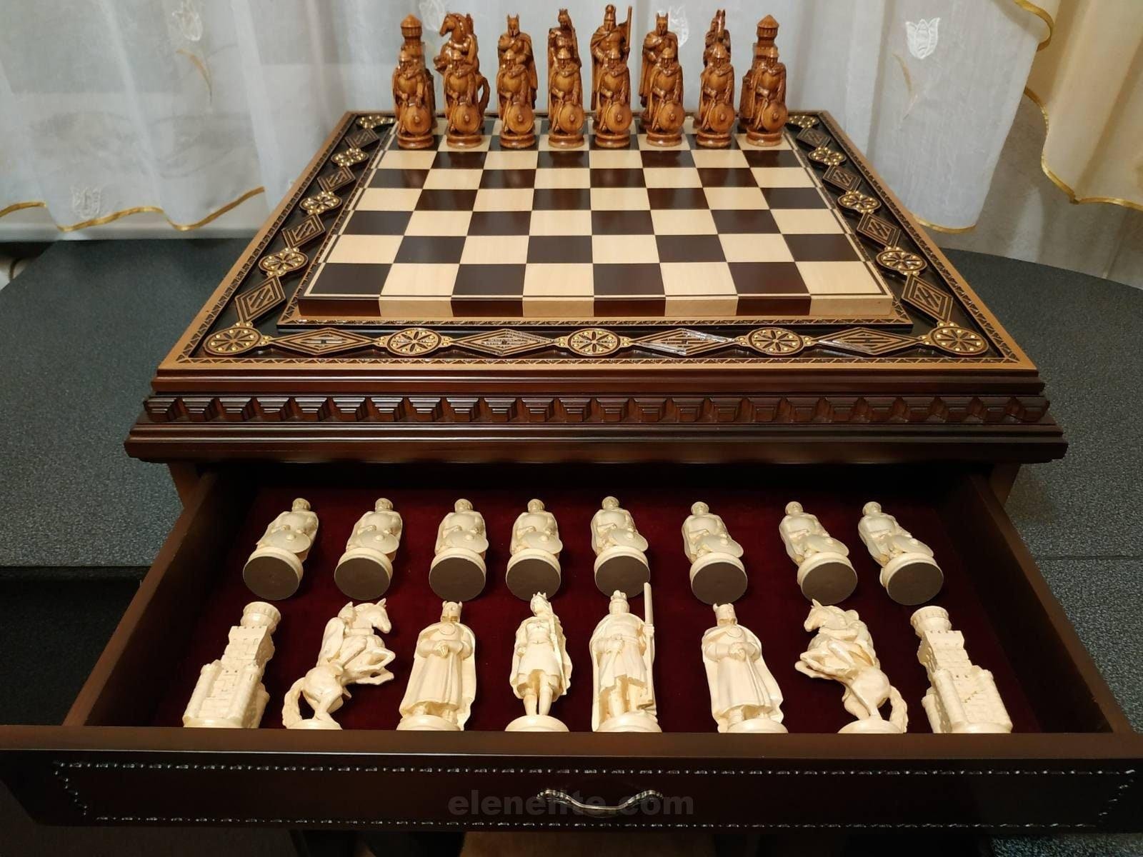 A gorgeous handcrafted chess set. The board is made of ash in a dark brown color with carvings along the edges and two drawers for storage. All 32 pieces are turned from maple and are made in the form of knights with highly detailed armor, swords and shields.