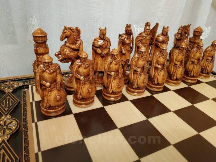 The main feature of the set is thematic chess pieces. All 32 elements are made in the images of medieval knights: in armor, with weapons and distinctive attributes. Each piece is handcarved from maple and carefully worked out to the smallest detail.