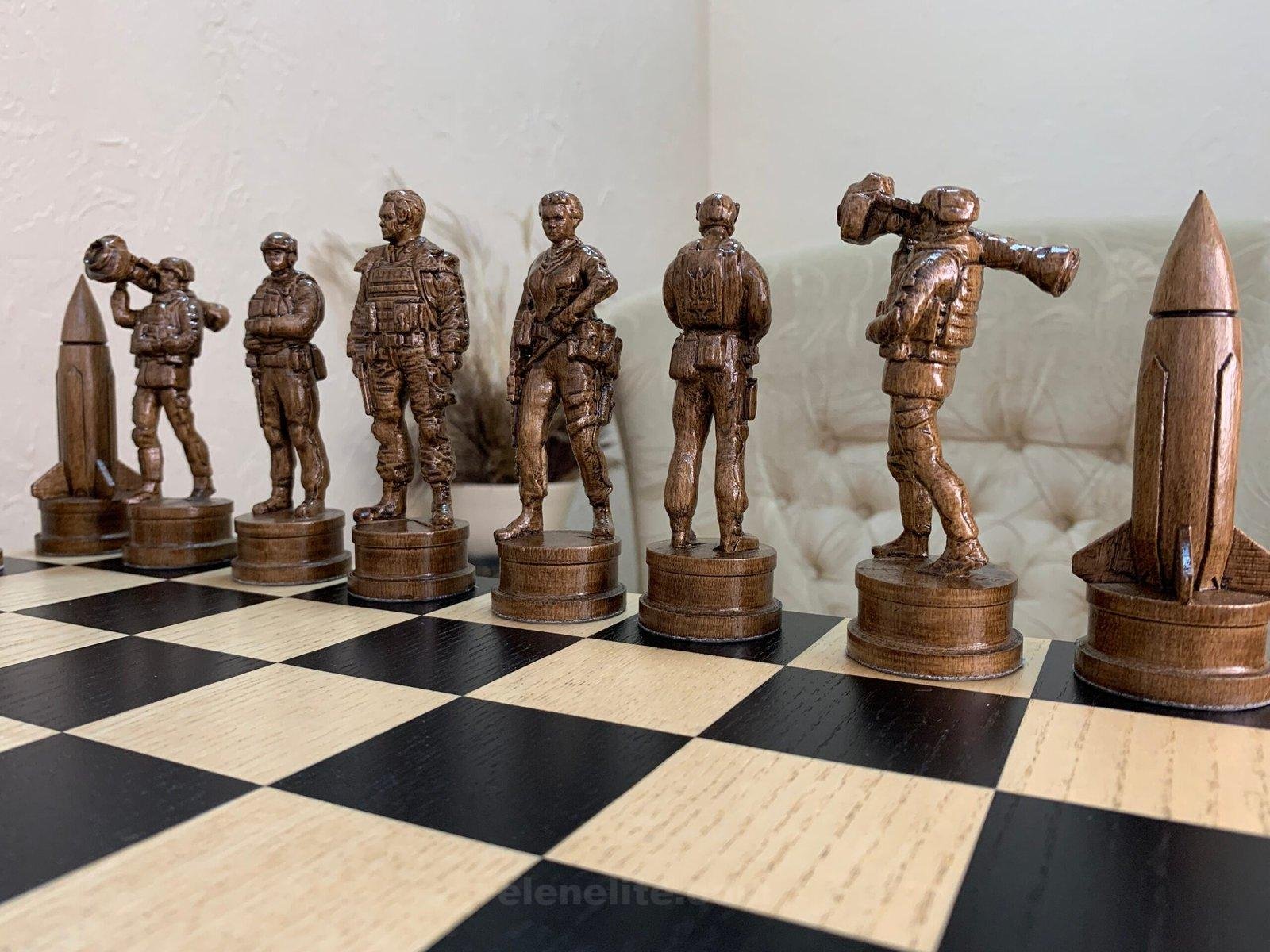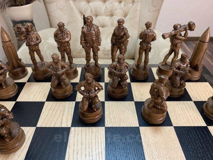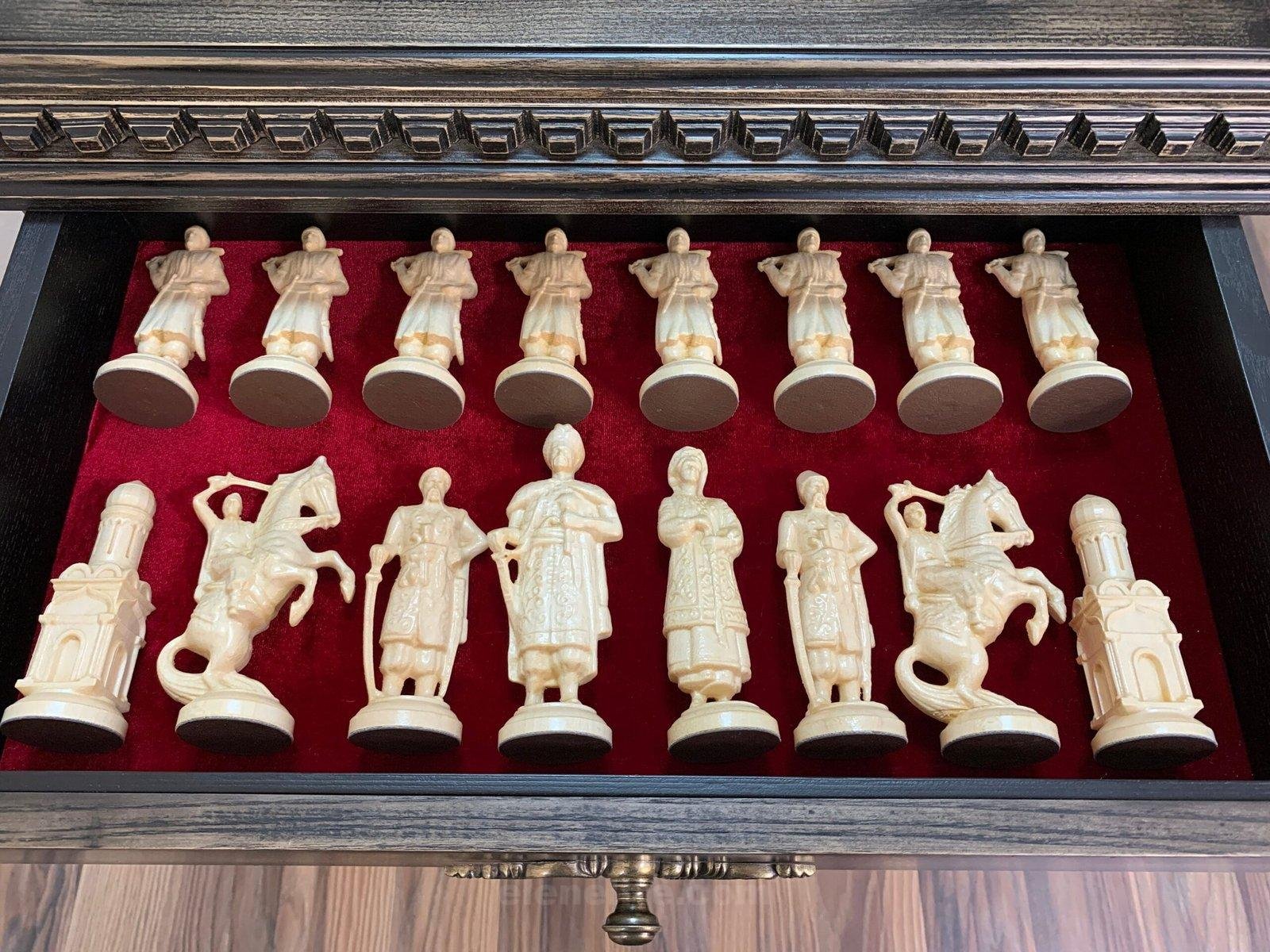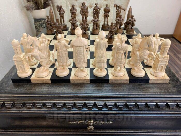 DESIGN: the board is equipped with 2 drawers for storing chess pieces; 16 chess pieces – Ukrainian heroes: Taras Shevchenko, Lesya Ukrainka, military and 16 pieces – Ukrainian Cossacks; exclusively designed by our “Elen Elite” craftsmen