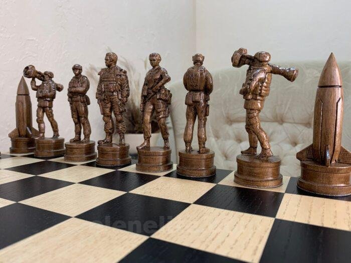 The chess set includes a table made of solid ash and covered with a black patina, emphasizing the natural texture of the wood. The design is equipped with two drawers, upholstered in soft velor, where each chess piece finds its place, maintaining an impeccable appearance and protection. The main decoration of the set is the exclusive handmade chess pieces. 16 pieces depict Ukrainian Cossacks, and another 16 – soldiers of the Ukrainian army. A special place is occupied by the king and queen: Taras Shevchenko and Lesya Ukrainka, recreated with premium detail. Each facial feature, each element of clothing and weapons are carefully worked out by the master, turning this set into a work of art.