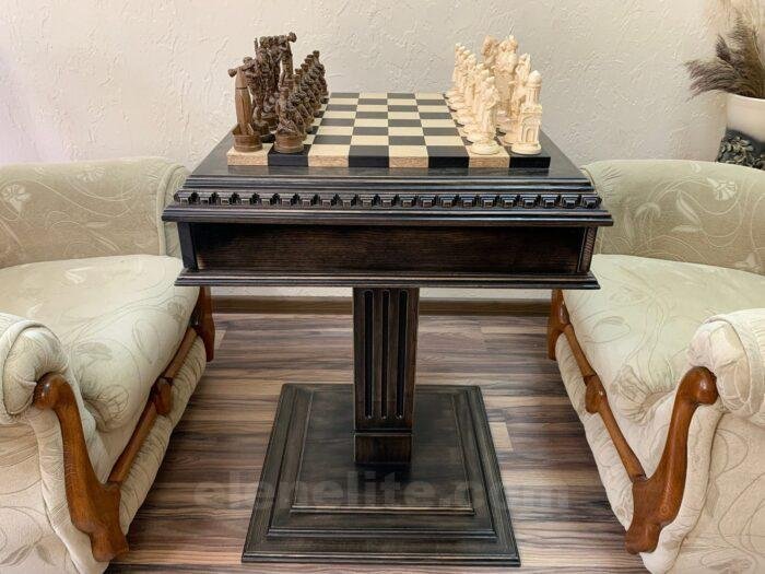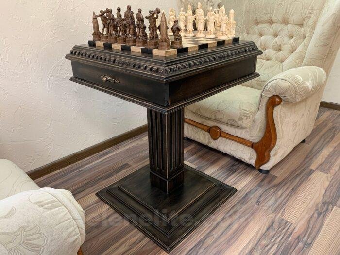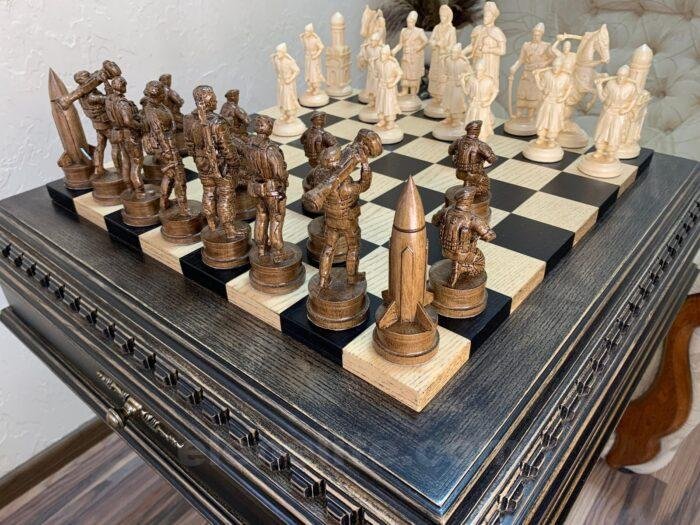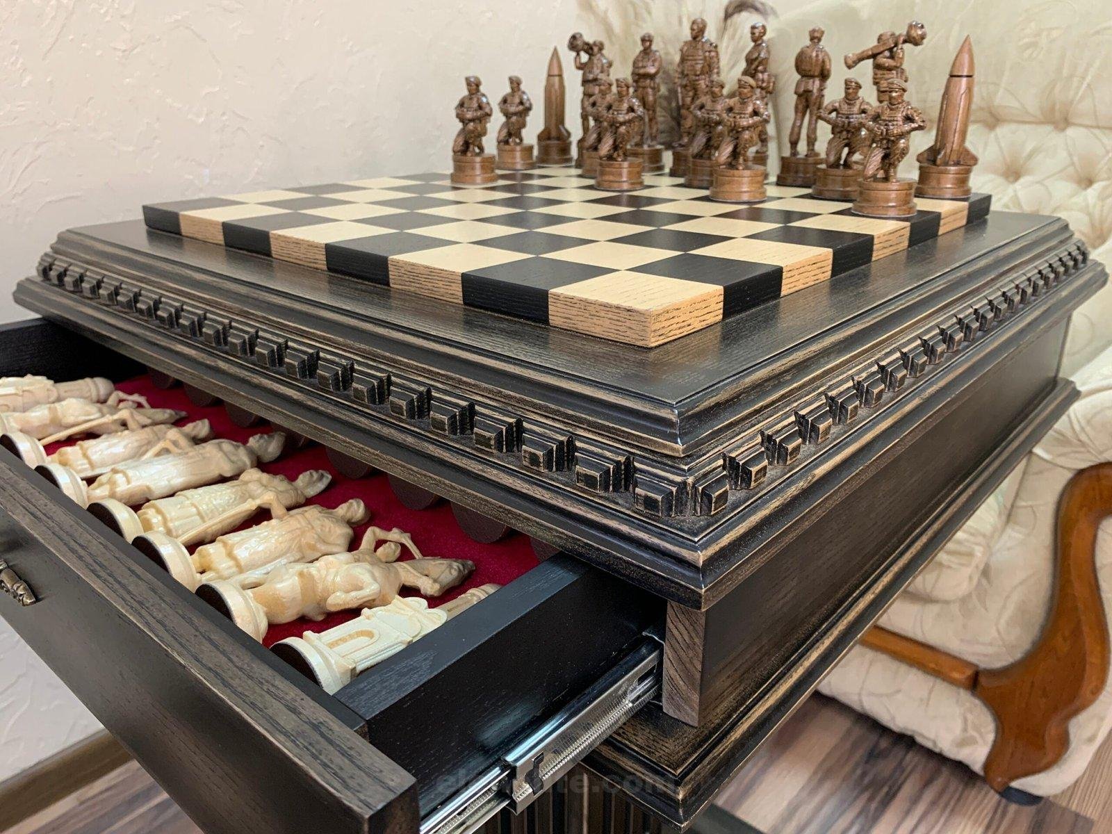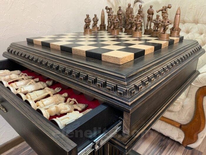Chess Set : Wooden Chess Table “Black stone” with drawers + pieces “Cossacks” & “Armed Forces of Ukraine”