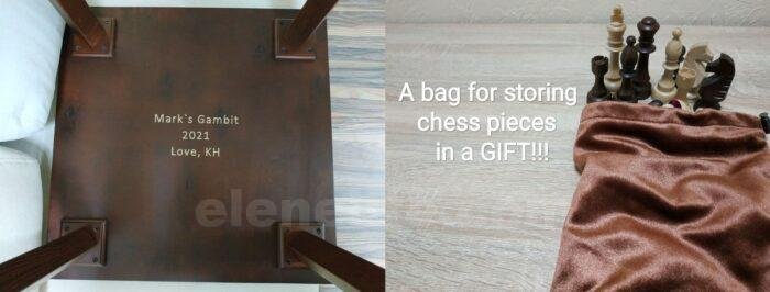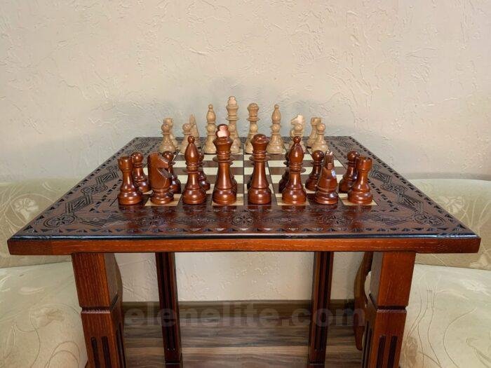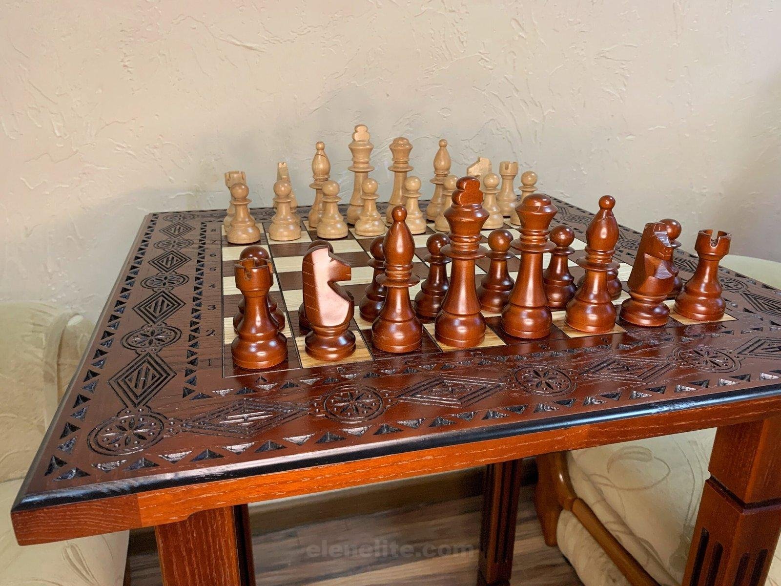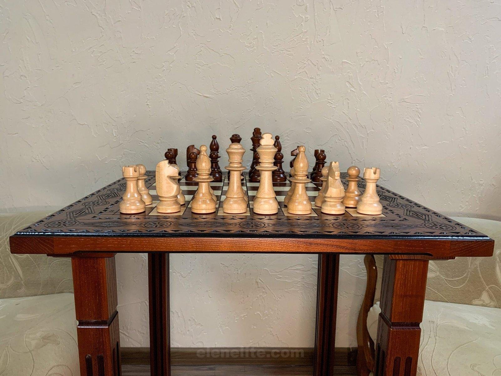 DESIGN: the chess board is decorated with carvings; the chess pieces are made in a classic style; exclusively designed by our “Elen Elite” craftsmen