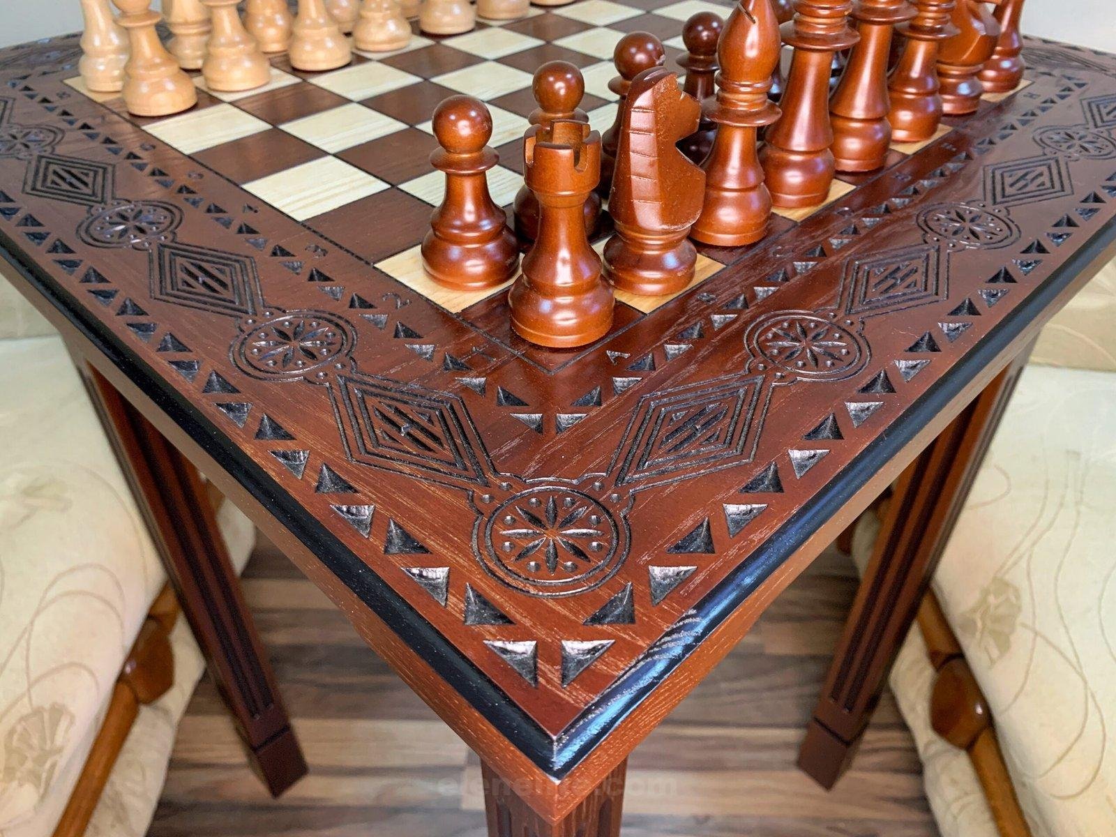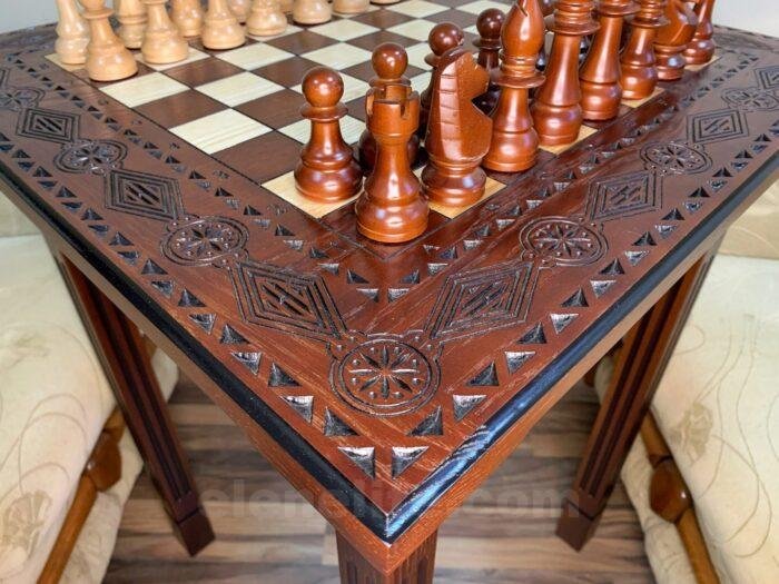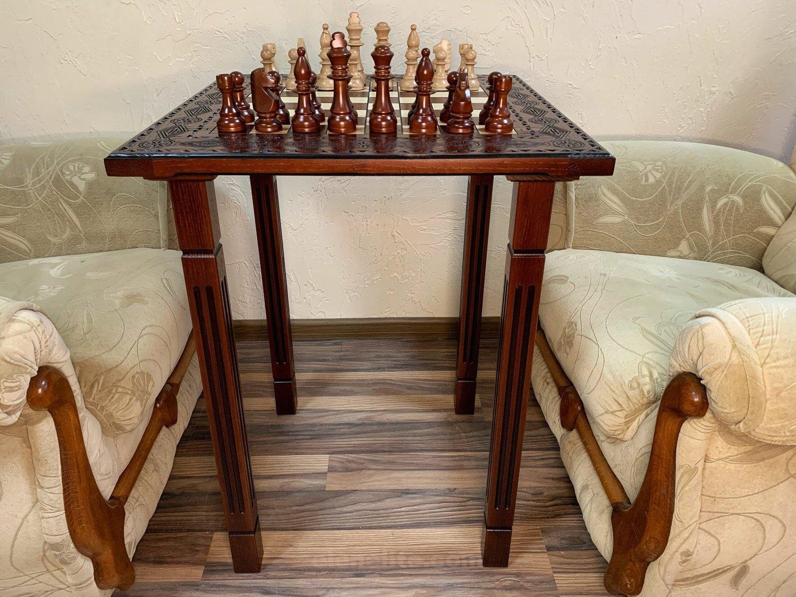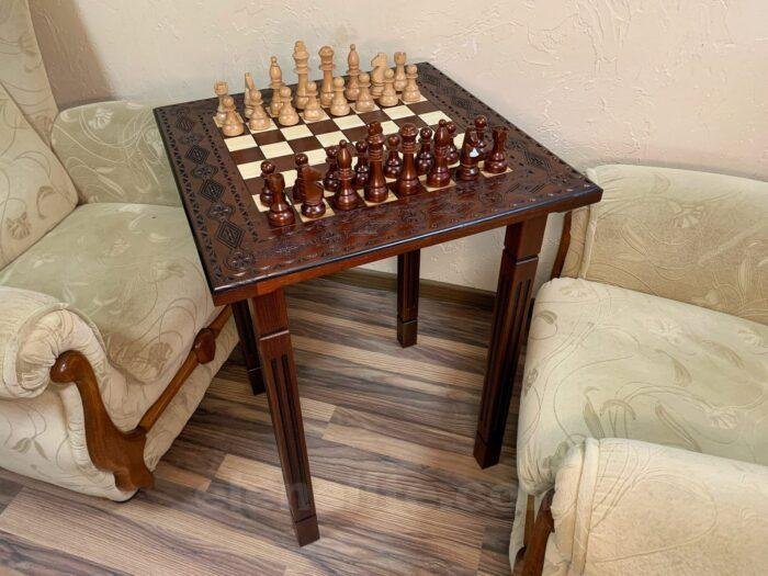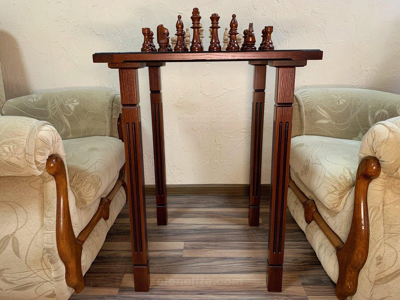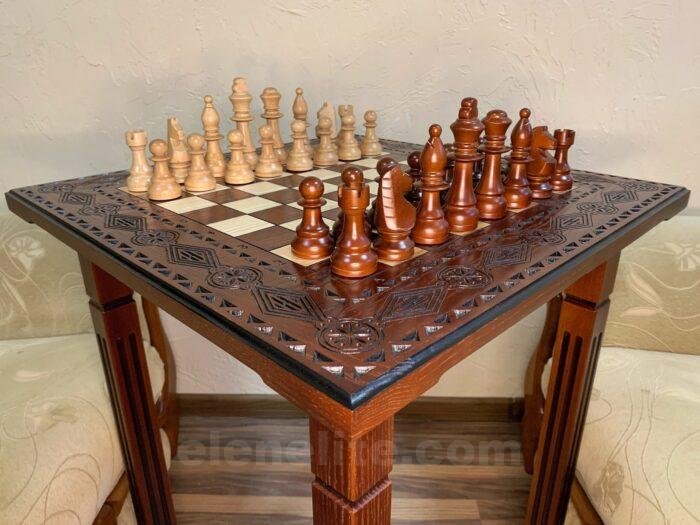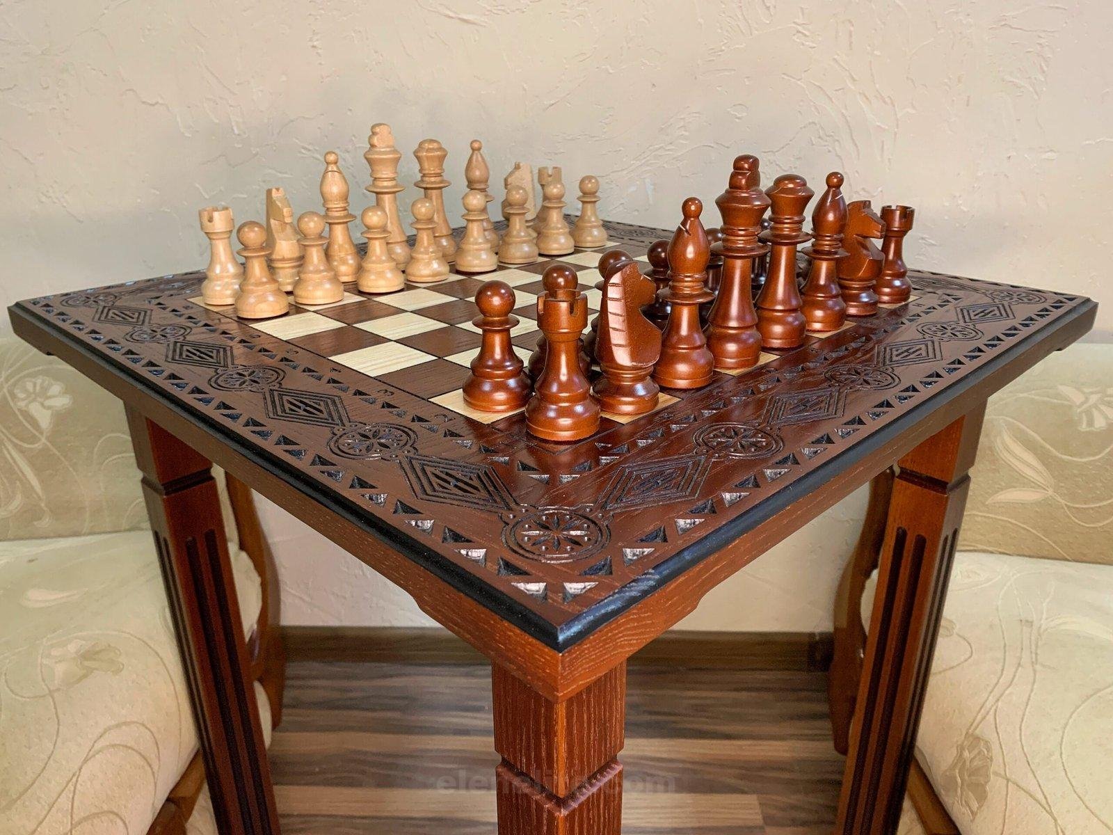 Classic chess set: ash table on four legs with carving and board markings, complemented by figures in a perfectly matched color. A stylish solution for connoisseurs of traditions and harmony in the interior.
