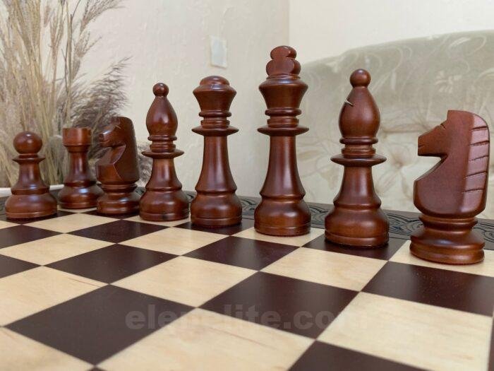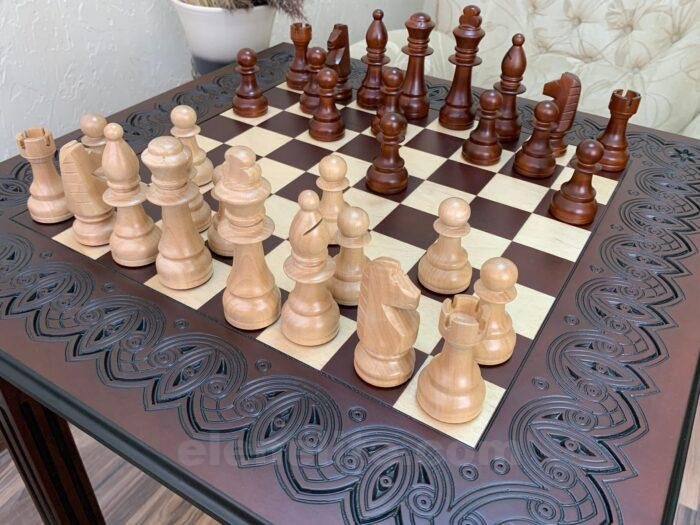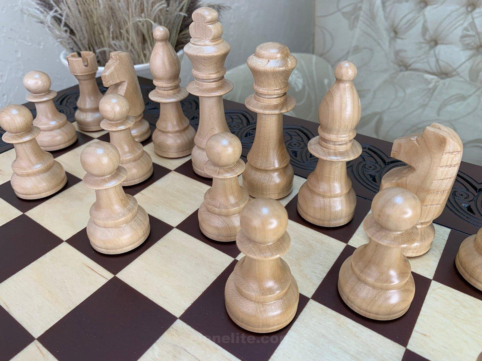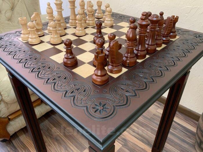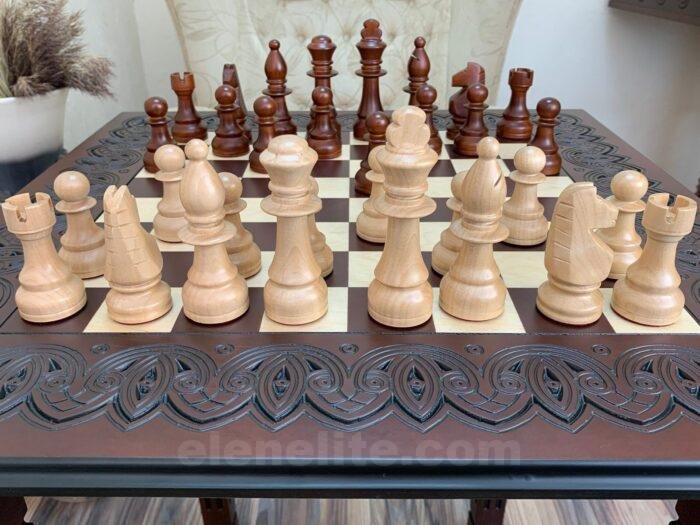 DESIGN: the chess board is decorated with carvings; the chess pieces are made in a classic style; exclusively designed by our “Elen Elite” craftsmen